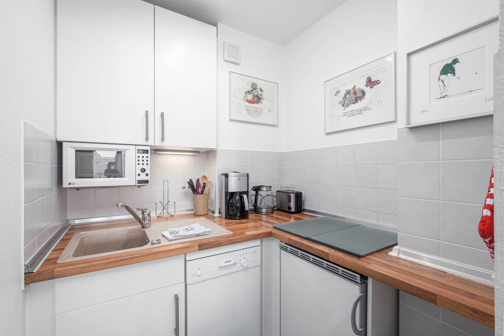 Im separaten Schlafzimmer finden bis zu 2 Personen im großzügigen Doppelbett einen Schlafplatz. In der voll ausgestatteten Einbauküche finden Sie mit einem Geschirrspüler, Mikrowelle und Kaffeemaschine alles Nötige zum Zubereiten leckerer Gerichte.