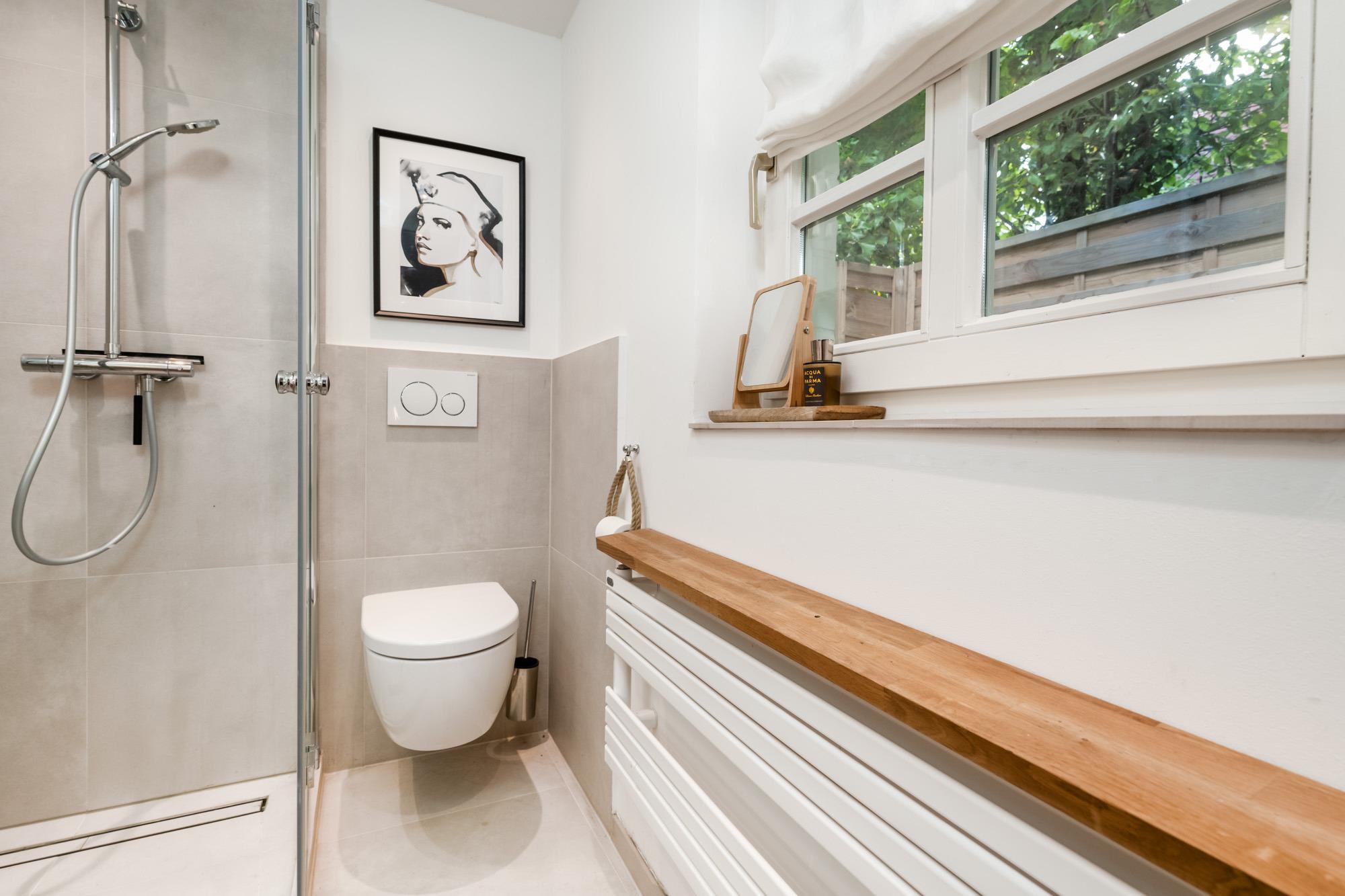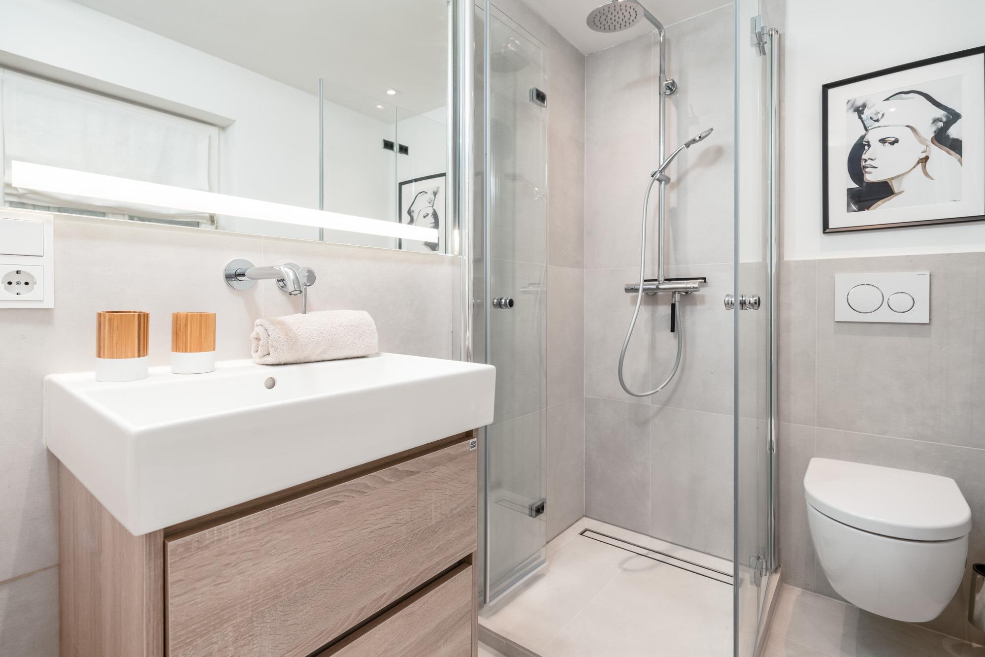 Das komfortable Badezimmer verfügt über eine Dusche mit niedrigem Einstieg und einem hochwertigen Waschtisch mit beleuchtetem Spiegel. Ein Föhn ist ebenfalls vorhanden.