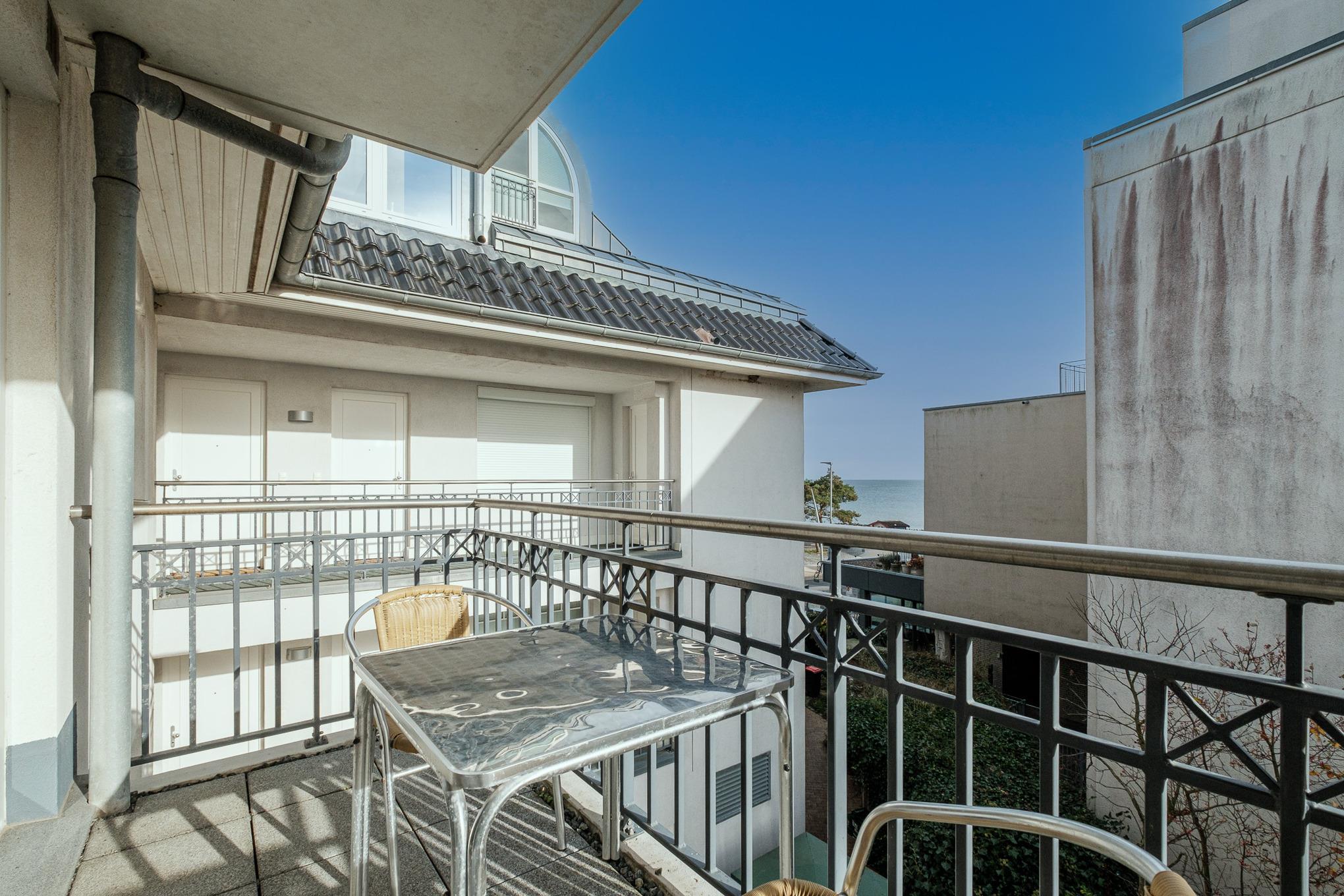 Den Balkon betreten Sie vom Wohnzimmer aus und erblicken von hier aus seitlich das Meer und den Ostseestrand.