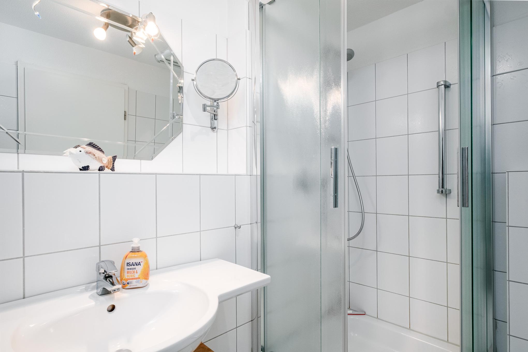 Im hellen Badezimmer mit Dusche, WC, Fön, Kosmetikspiegel sowie einem Handtuchwärmer erfrischen Sie sich von entspannten Tagen am Strand.