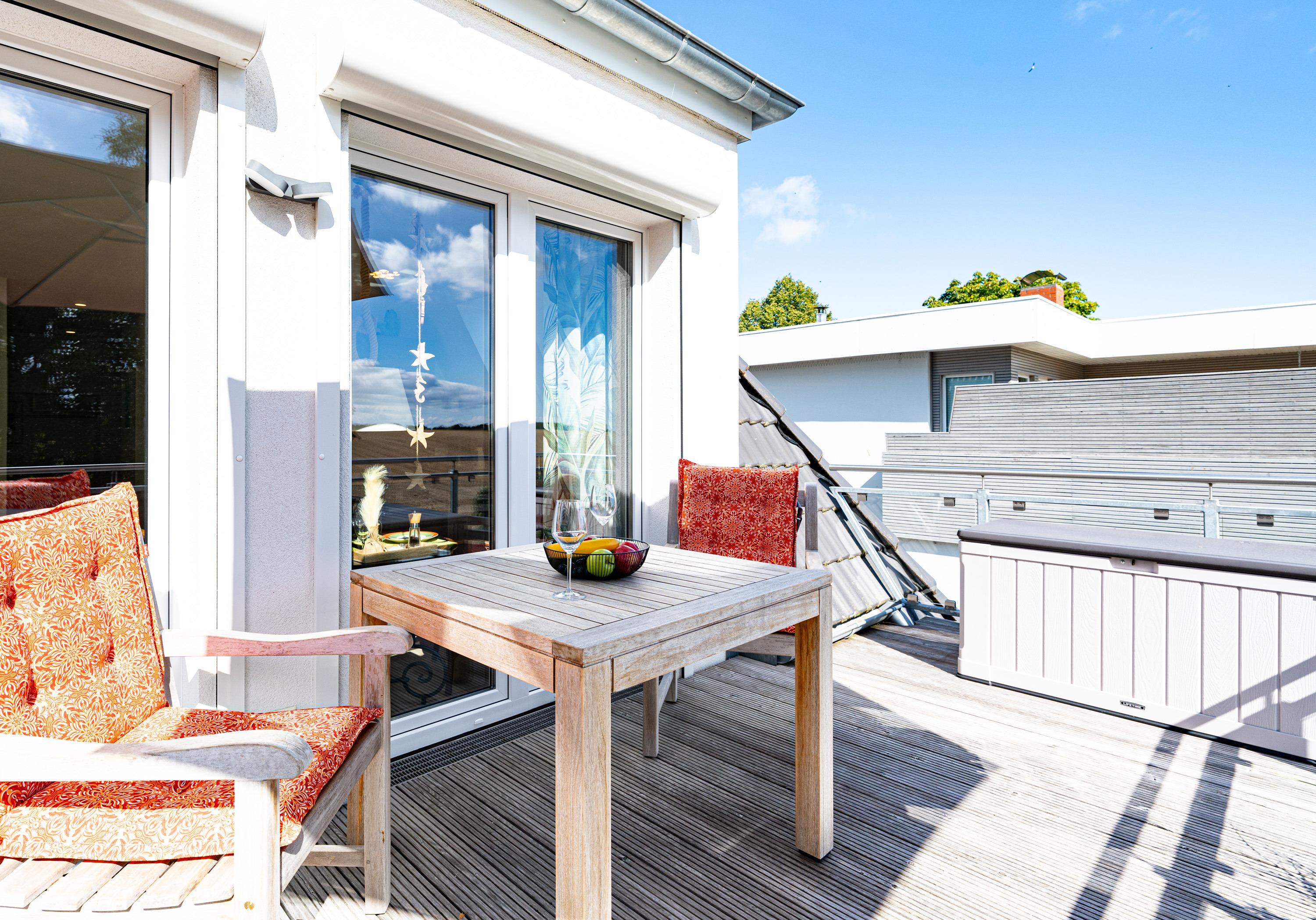 Die Besonderheit dieser modernen Niendorf Ferienwohnung ist die schöne, geräumige, 18m² große Dachterrasse zur Ostseite.