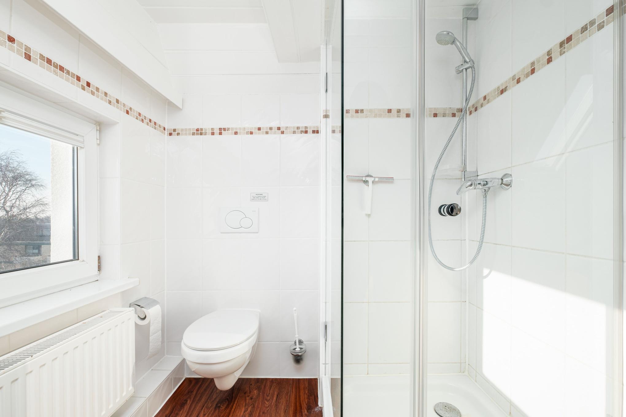 Das hell geflieste Badezimmer ist mit einer Dusche, WC, Fön sowie einem Kosmetikspiegel eingerichtet.