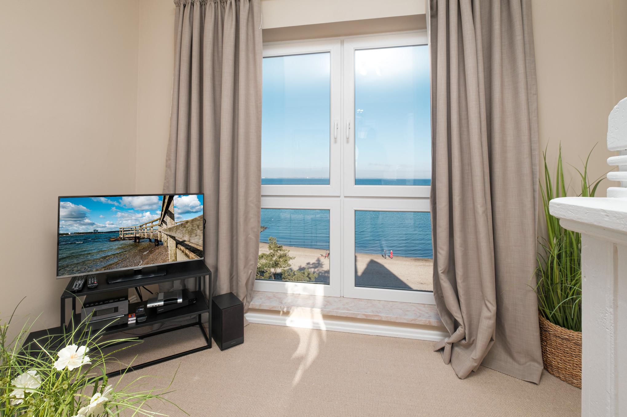 Das Wohnzimmer verfügt über eine gemütliche Couchgarnitur mit Flachbild-TV, DVD-Player und HiFi-Anlage. Hier verbringen Sie schöne Stunden zu zweit und genießen einen wunderschönen Meerblick auf die Lübecker Bucht der Ostsee.