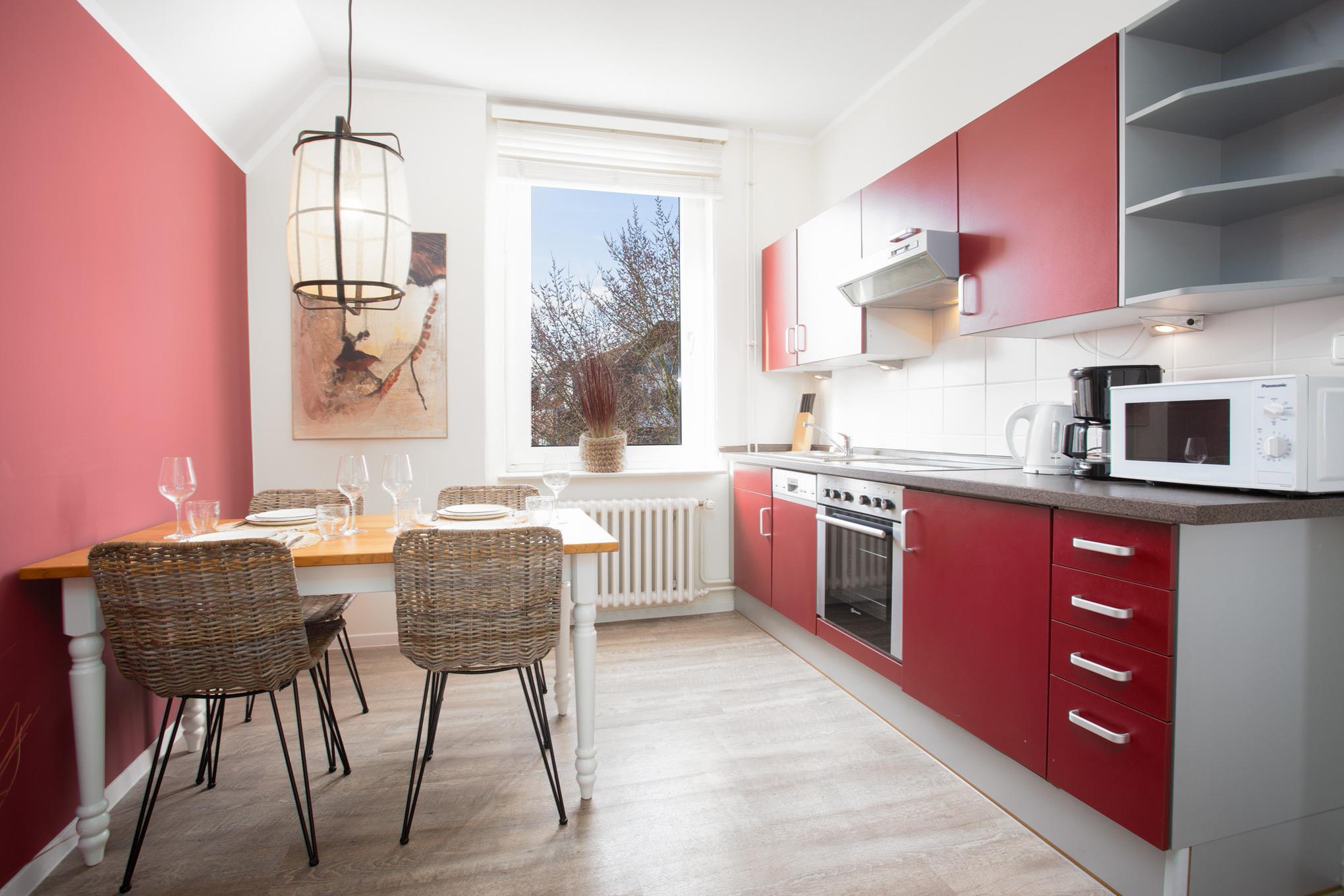 In der modernen Küche mit Geschirrspüler und Mikrowelle finden Sie eine schöne Essecke vor, wo Sie die Mahlzeiten zusammen zu sich nehmen oder spaßige, gemeinsame Kochsession's veranstalten können.
