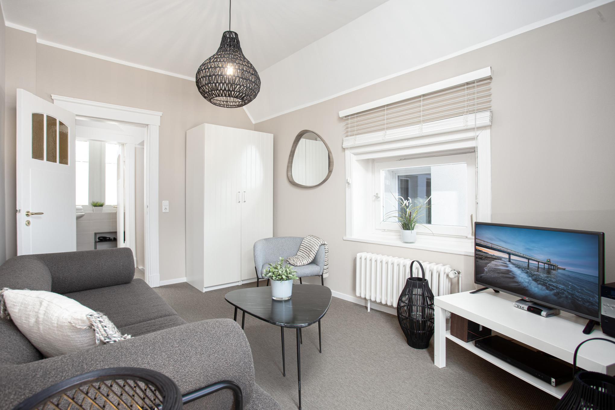 Das gemütliche Wohnzimmer ist mit einer Einzelschlafcouch, HiFi-Anlage, Flachbild-TV und Blu-Ray-Player ausgestattet und verfügt über einen direkten Meerblick auf die Ostsee.