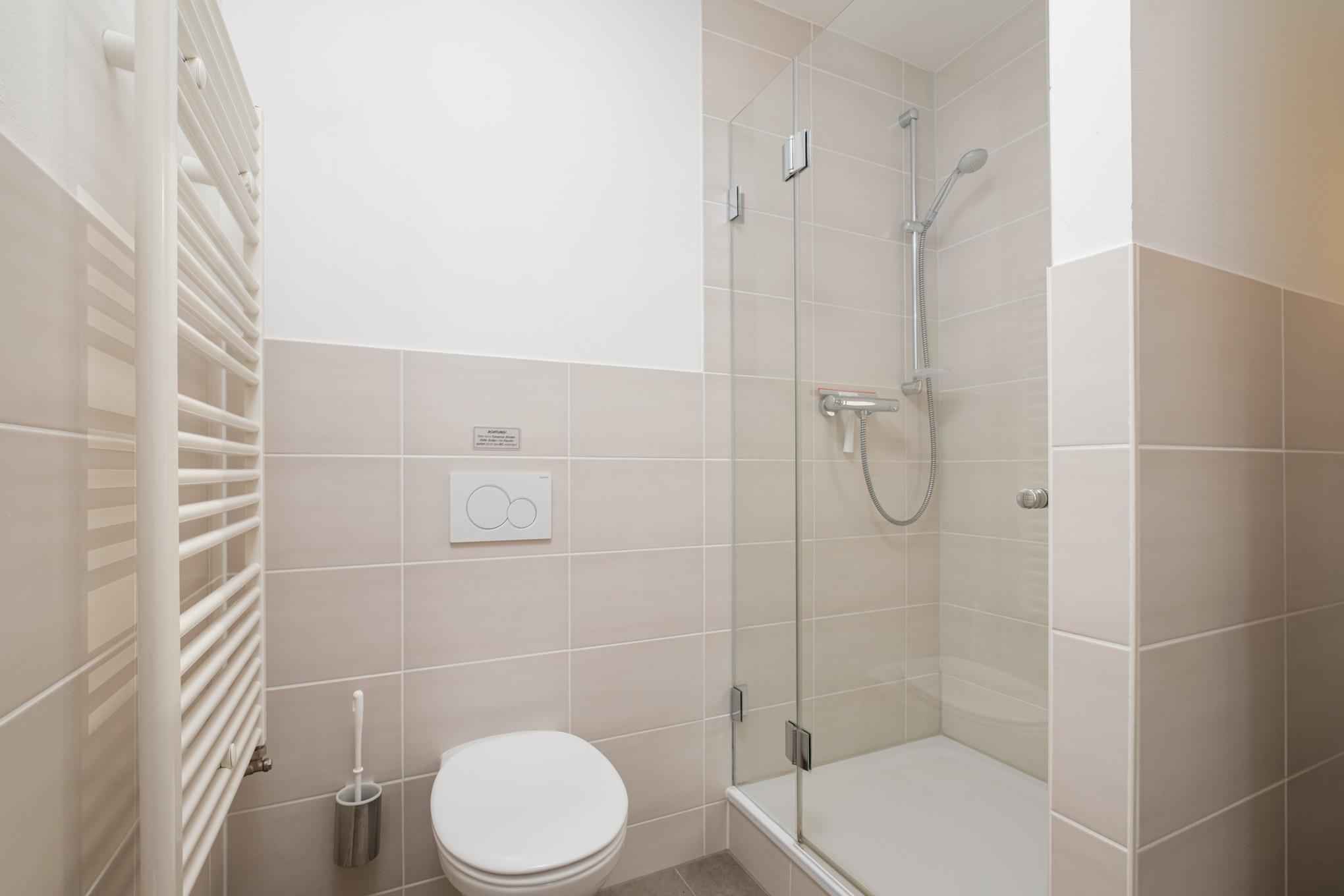 Das Badezimmer ist mit einer Dusche, WC, Fön und Kosmetikspiegel sowie einem Handtuchwärmer eingerichtet.
