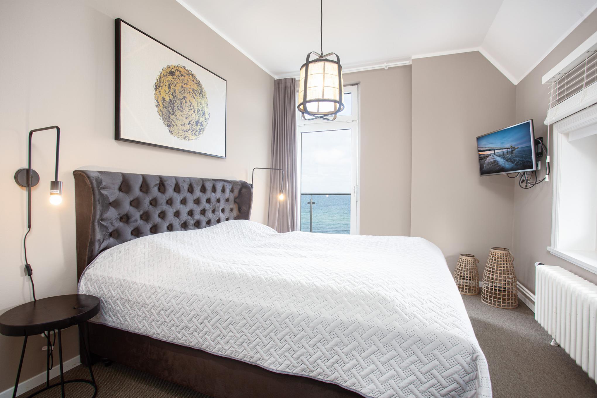Das helle Schlafzimmer hat ein bequemes Doppelbett mit Flachbild TV und vom Bett aus genießen Sie ebenfalls einen fabelhaften, direkten Blick auf die Ostsee.