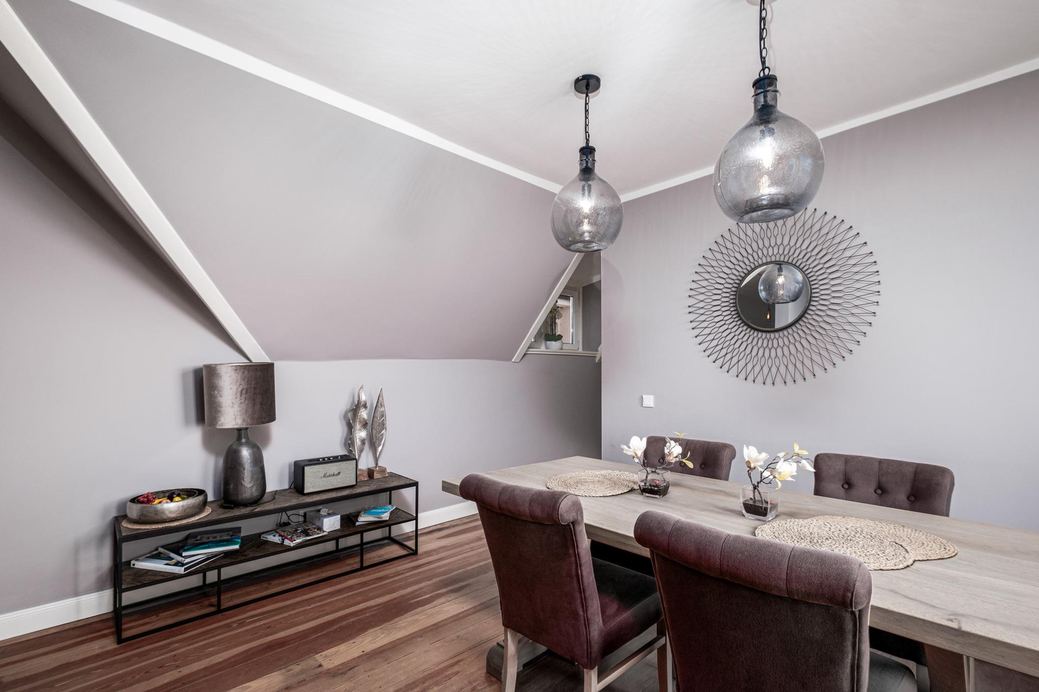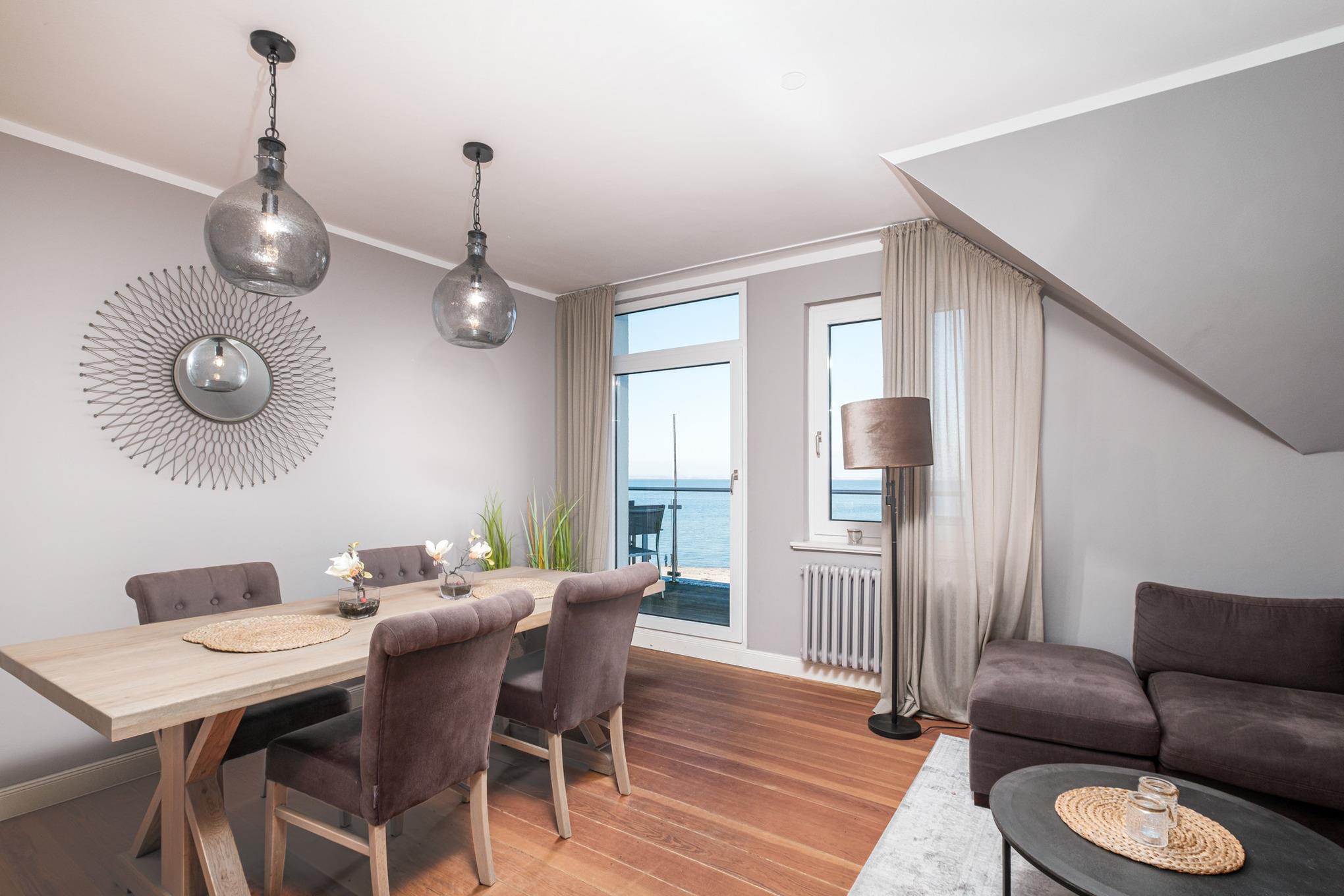 Im Wohnzimmer finden Sie eine gemütliche Couchgarnitur mit Digital-TV und Bluetooth-Lautsprecher sowie einen großen Essbereich vor. Ideal können Sie hier ausgelassene Spieleabende veranstalten und haben von hier Zugang zum großen Balkon, von dem aus Sie einen herrlichen Blick auf die schöne Lübecker Bucht der Ostsee genießen können.