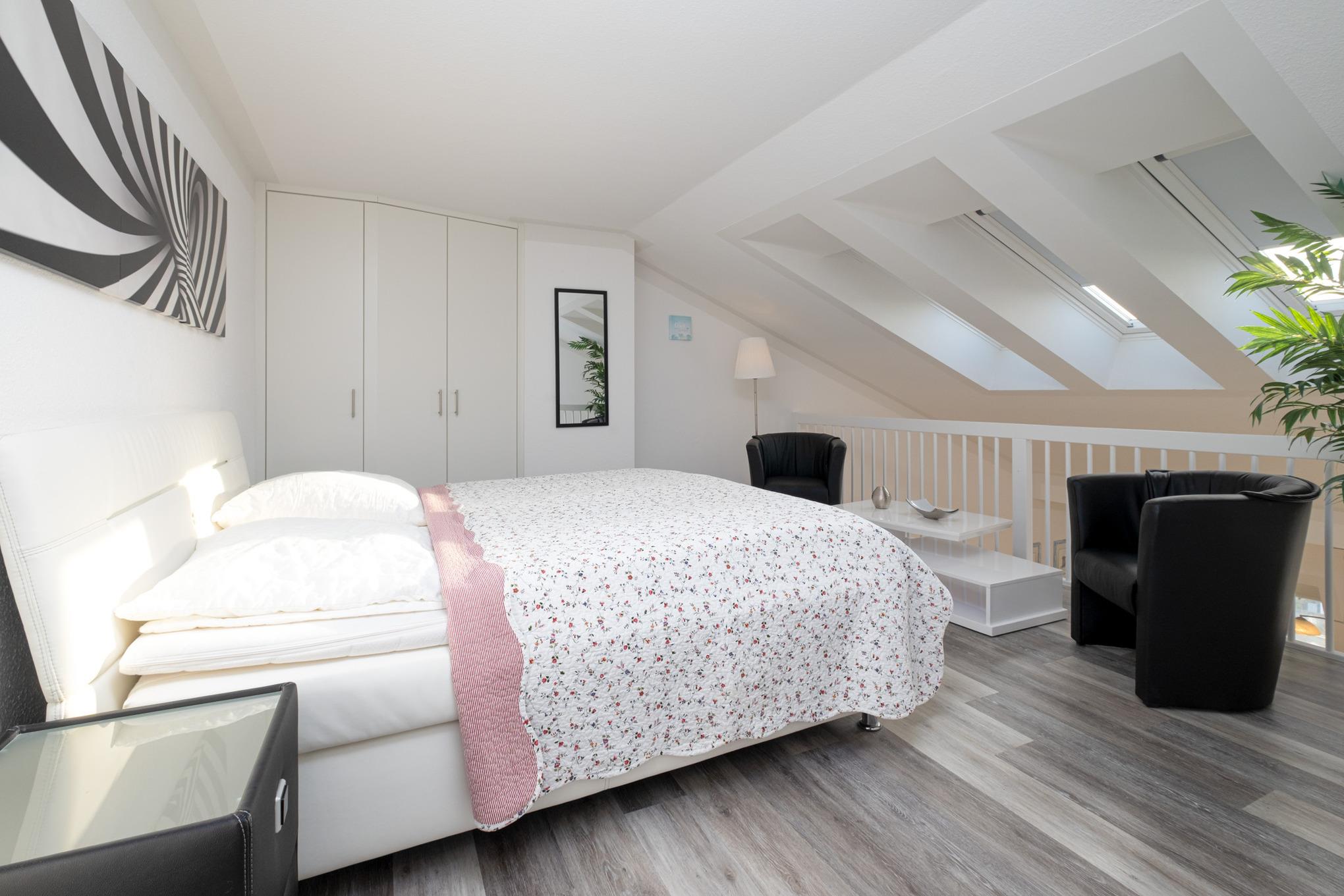 Der offene, gemütliche Schlafraum auf der Galerie ist mit einem bequemen Boxspringbett (1 x 180 cm x 200 cm) eingerichtet.