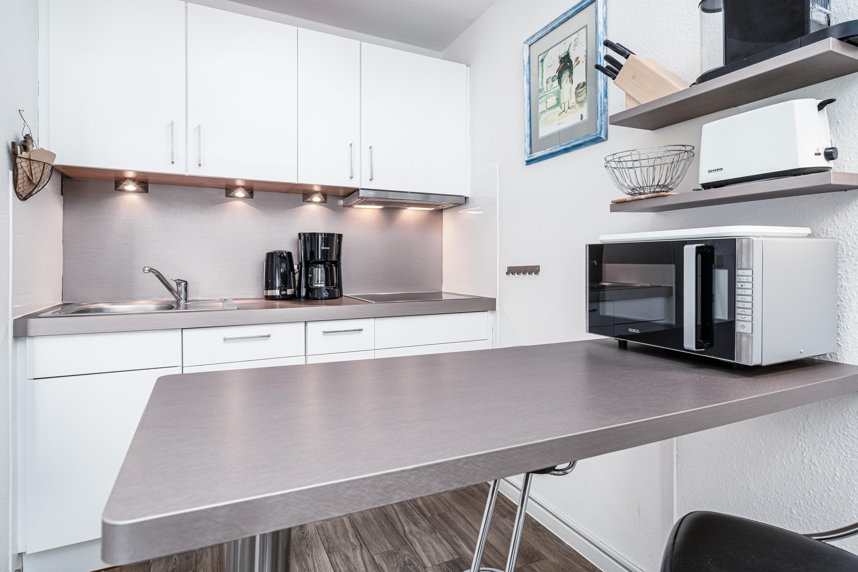 Der große, helle Wohnraum ist mit einer Essecke, Kabel-TV, DVD-Player, HiFi-Anlage und integrierter Einbauküche ausgestattet. In der Küche stehen Ihnen auch Geschirrspüler und Mikrowelle zur Verfügung.
