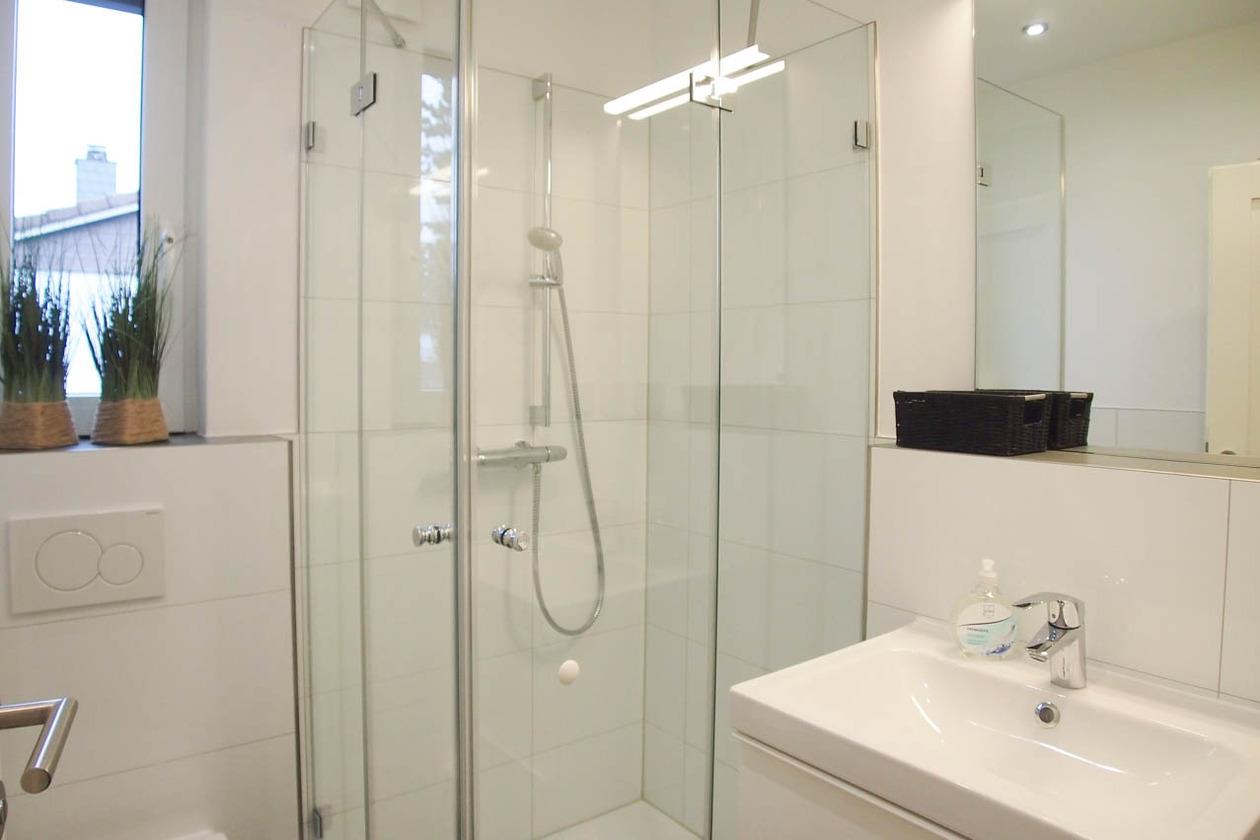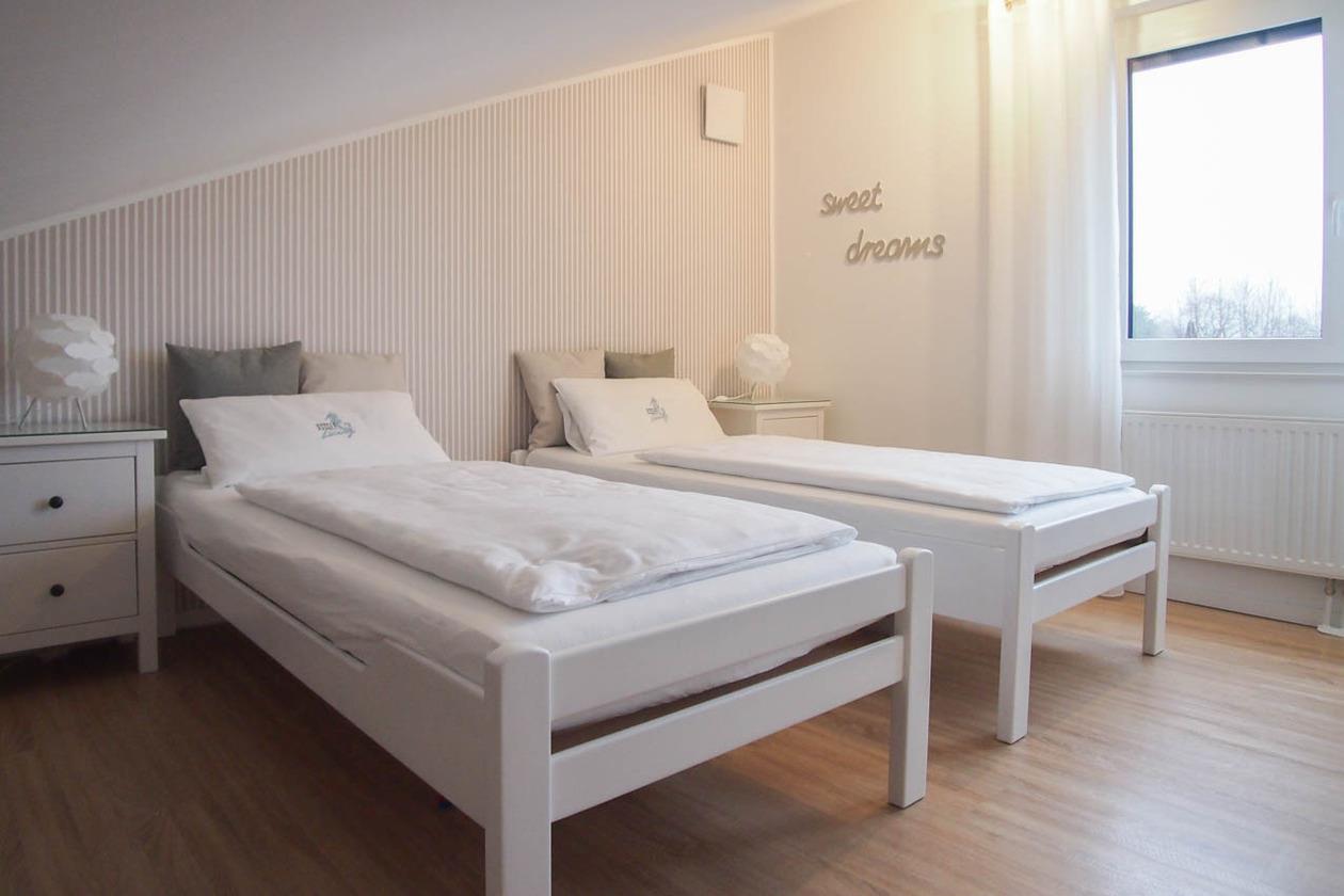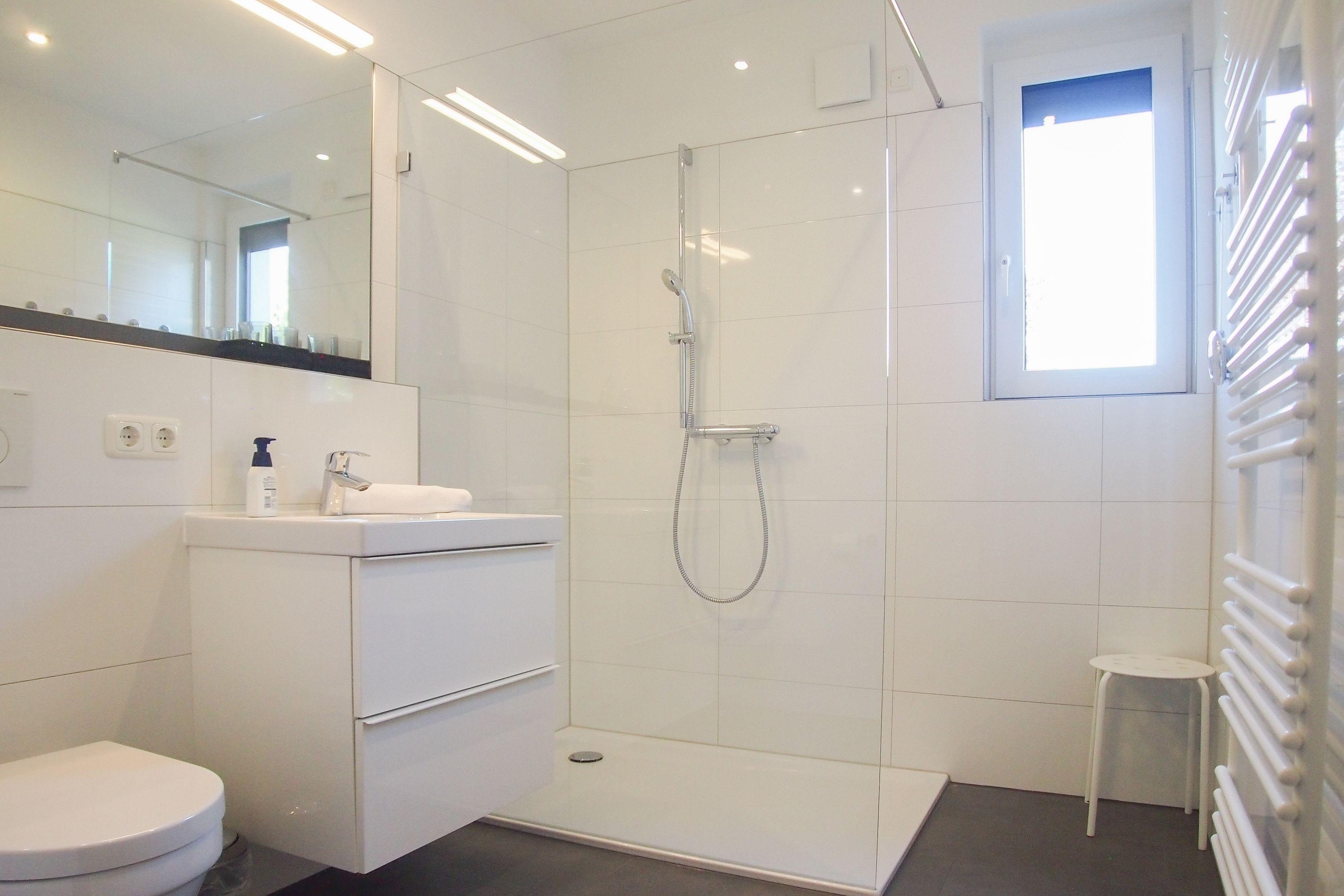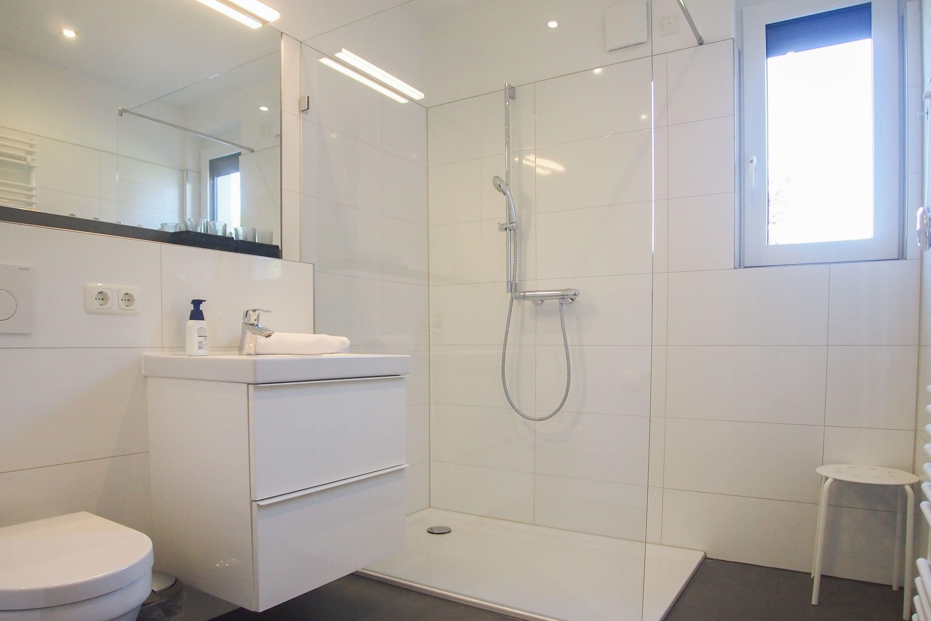 Im Erdgeschoss befinden sich neben zwei geräumigen Schlafzimmern mit Doppelbetten (180x200), eines mit zusätzlichem TV und Terrassenzugang, zwei hochwertige Duschbäder, eine bestens ausgestattete Küche und der großzügige Wohn- und Essbereich mit vorgelagerter Sonnenterrasse. WLAN, TV und Bluetooth Anlage sind vorhanden. Im separaten Abstellraum sind Waschmaschine und Trockner untergebracht. Im Obergeschoss befindet sich ein weiteres Schlafzimmer mit zwei Einzelbetten (90x200) und TV. Sämtliche Fenster sind mit elektrischen Außenjalousien versehen. Am Haus befindet eine E-Ladestation (kostenpflichtig).