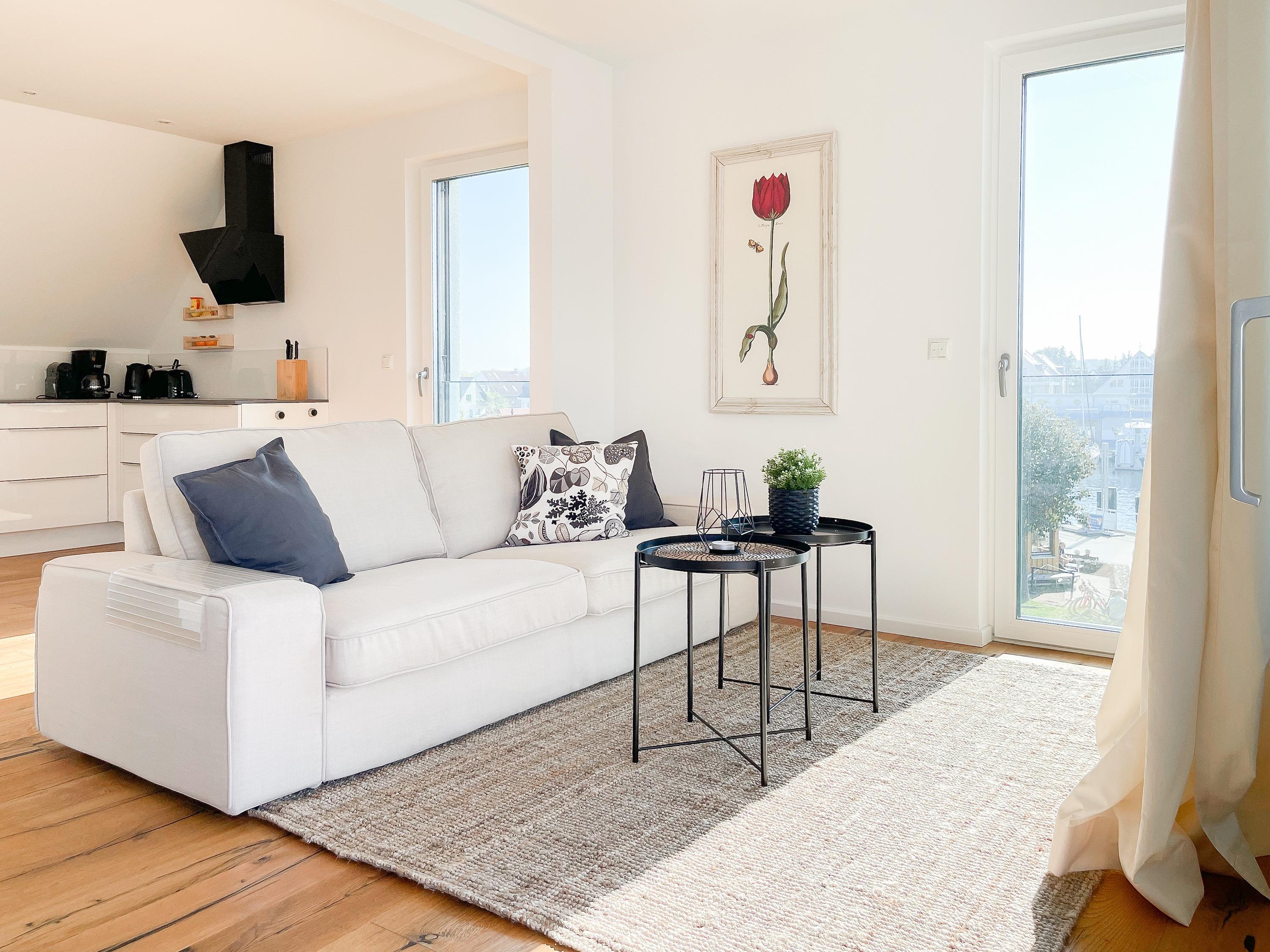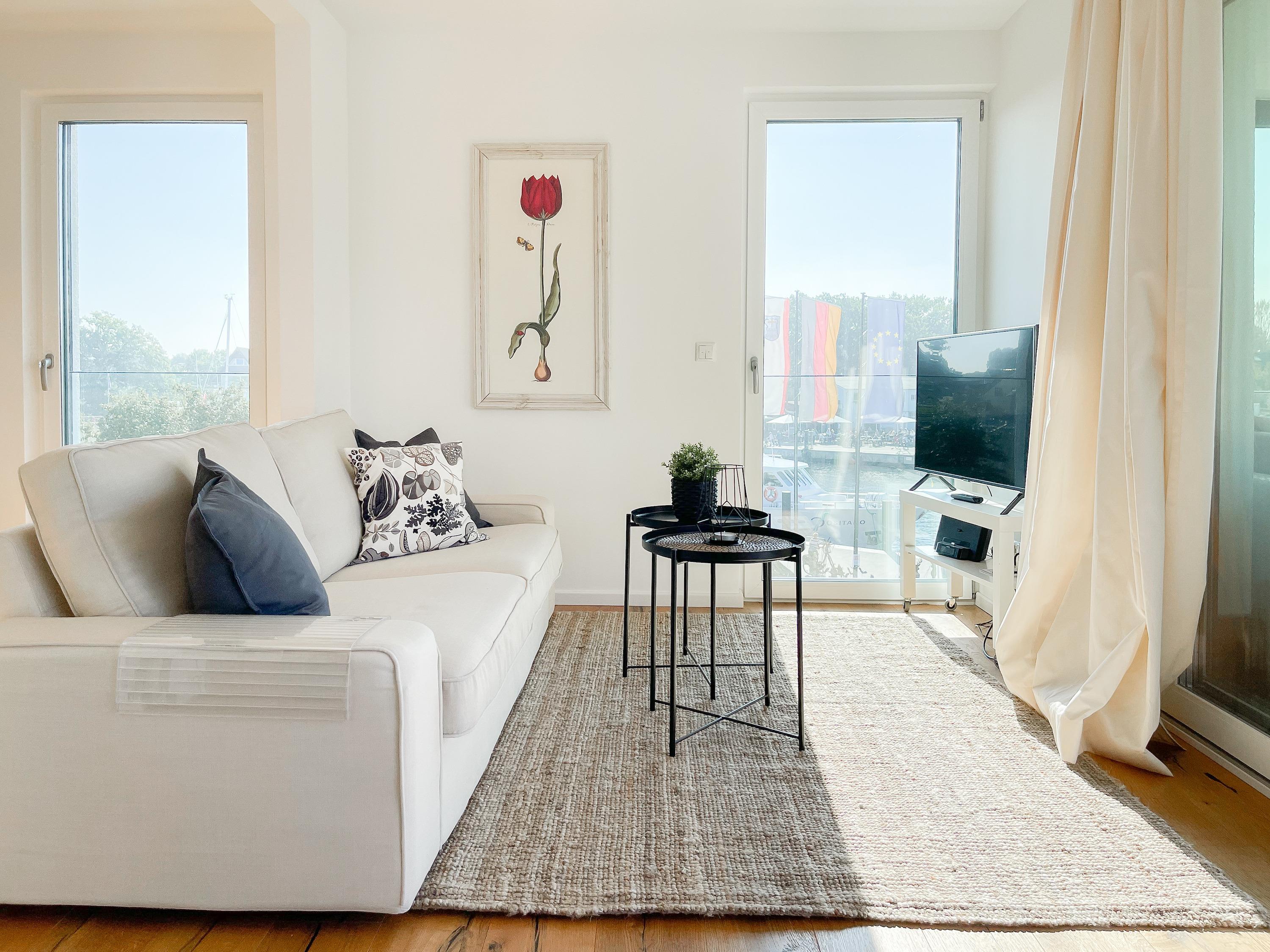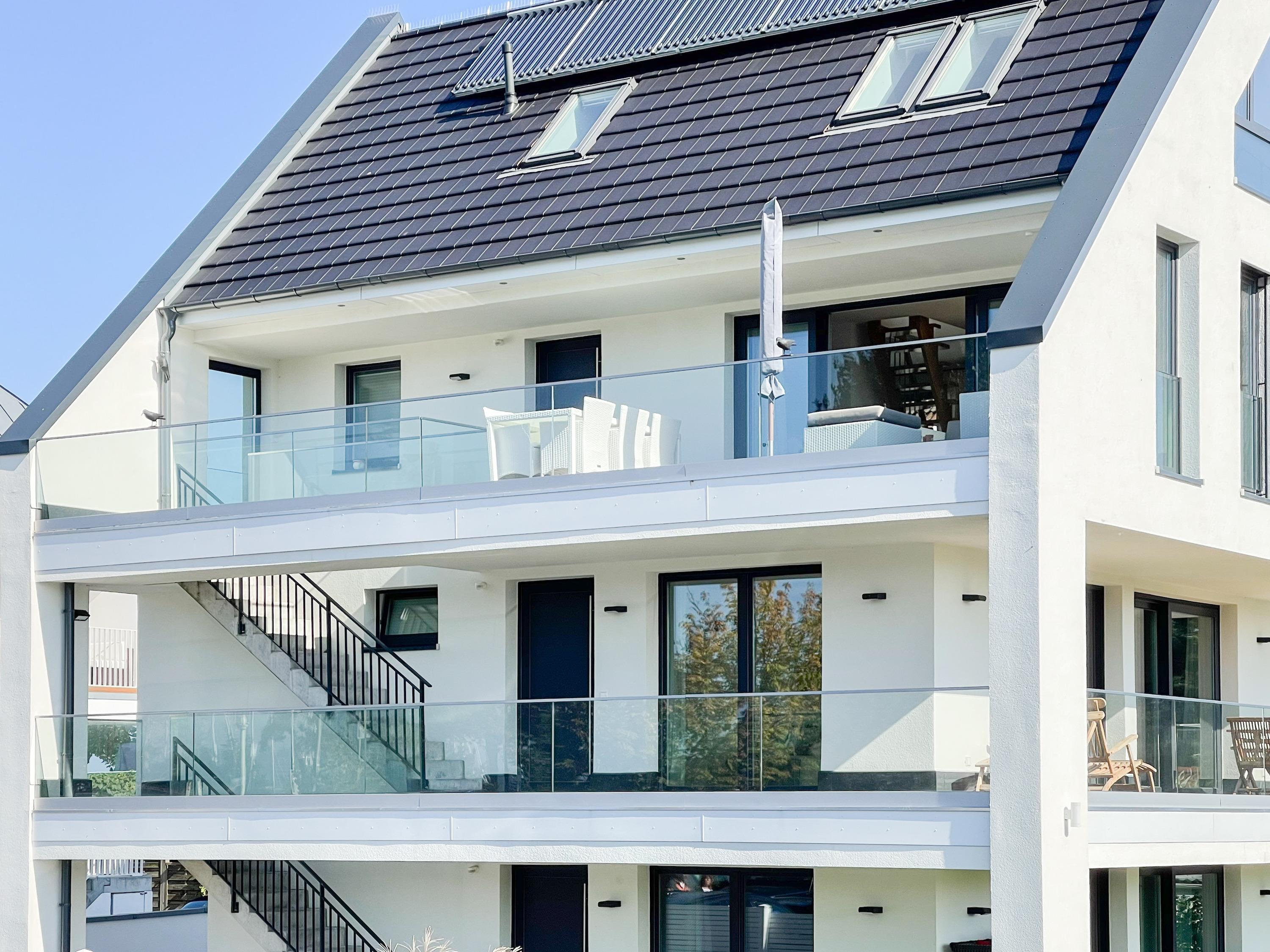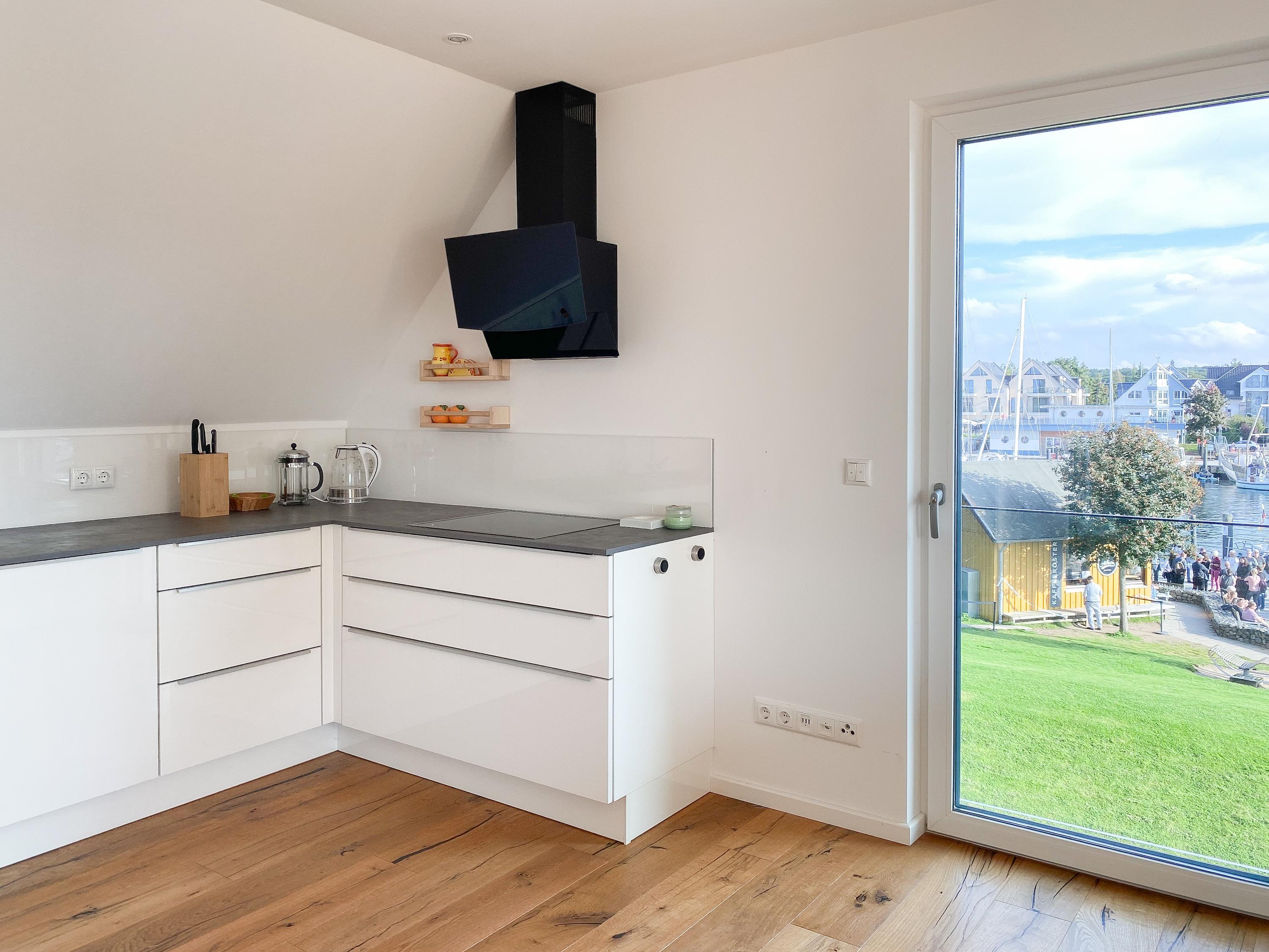 Das einzigartige Penthouse erstreckt sich über 2 Ebenen und liegt im 2. Obergeschoss eines modernen Neubaus mit nur 3 Wohneinheiten. Auf 130 qm Wohnfläche mit 2 Schlafzimmern, 2 separaten Bädern und 2 Wohnbereichen können 4 Personen einen entspannten Urlaub verleben. Auf der unteren Wohnebene erwartet Sie ein Schlafzimmer mit Doppelbett, Verdunkelungsplissees und Ostseeblick, ein Duschbad sowie ein offener Wohn- Essbereich, TV und eine integrierte moderne Einbauküche. Bodentiefe[nbsp] Fensterelemente bieten einem phantastischen Ausblick auf die Ostsee und die ein- und ausfahrenden Schiffe vom Fischkutter bis zur Motoryacht.[nbsp] Echtholzböden und Fußbodenheizung sorgen für ein angenehmes Raumklima. Die sehr großzügig angelegte Dachterrasse vor dem Wohnbereich ist mit einer Gartenlounge und einem Essbereich ausgestattet. Genießen Sie viele Sonnenstunden, die einzigartige Hafenatmosphäre und beeindruckende Sonnenuntergänge bei einem Glas Wein. Vor dem Essbereich befindet sich eine weitere Dachterrasse mit Bistrotisch und 2 Stühlen, um die ersten Sonnenstrahlen mit Ostseeblick bei einem Morgenkaffee zu genießen. Die zweite Wohnebene ist über eine schmale recht steile Raumspartreppe zu erreichen. Hier erwartet Sie ein weiterer Wohnbereich mit traumhaftem Blick auf den Hafen und das zweite Schlafzimmer mit TV, Ostseeblick und Verdunkelungsplissees, ebenfalls mit Doppelbett (160x200) sowie ein weiteres Duschbad.