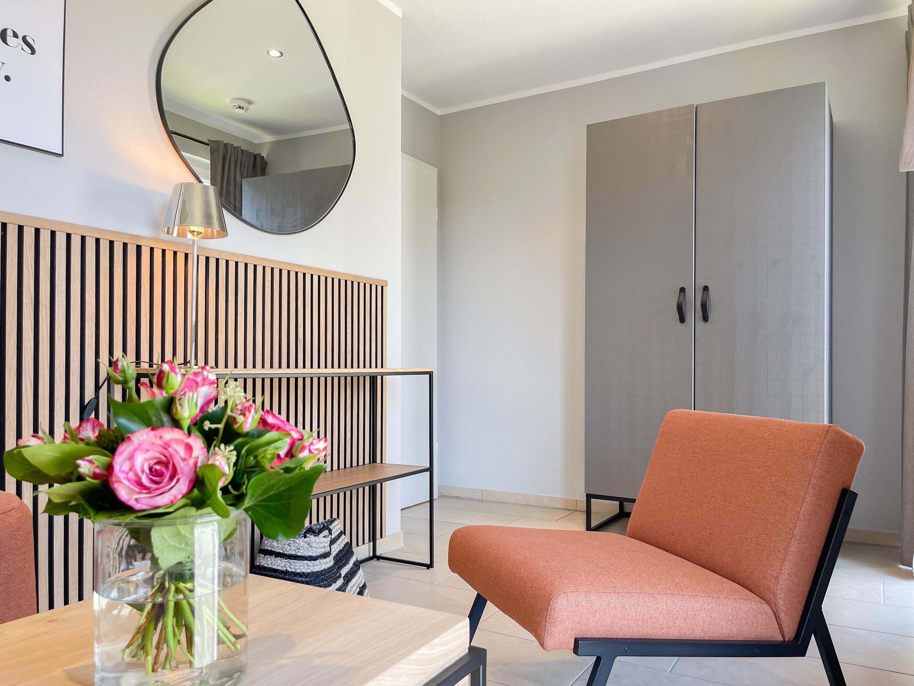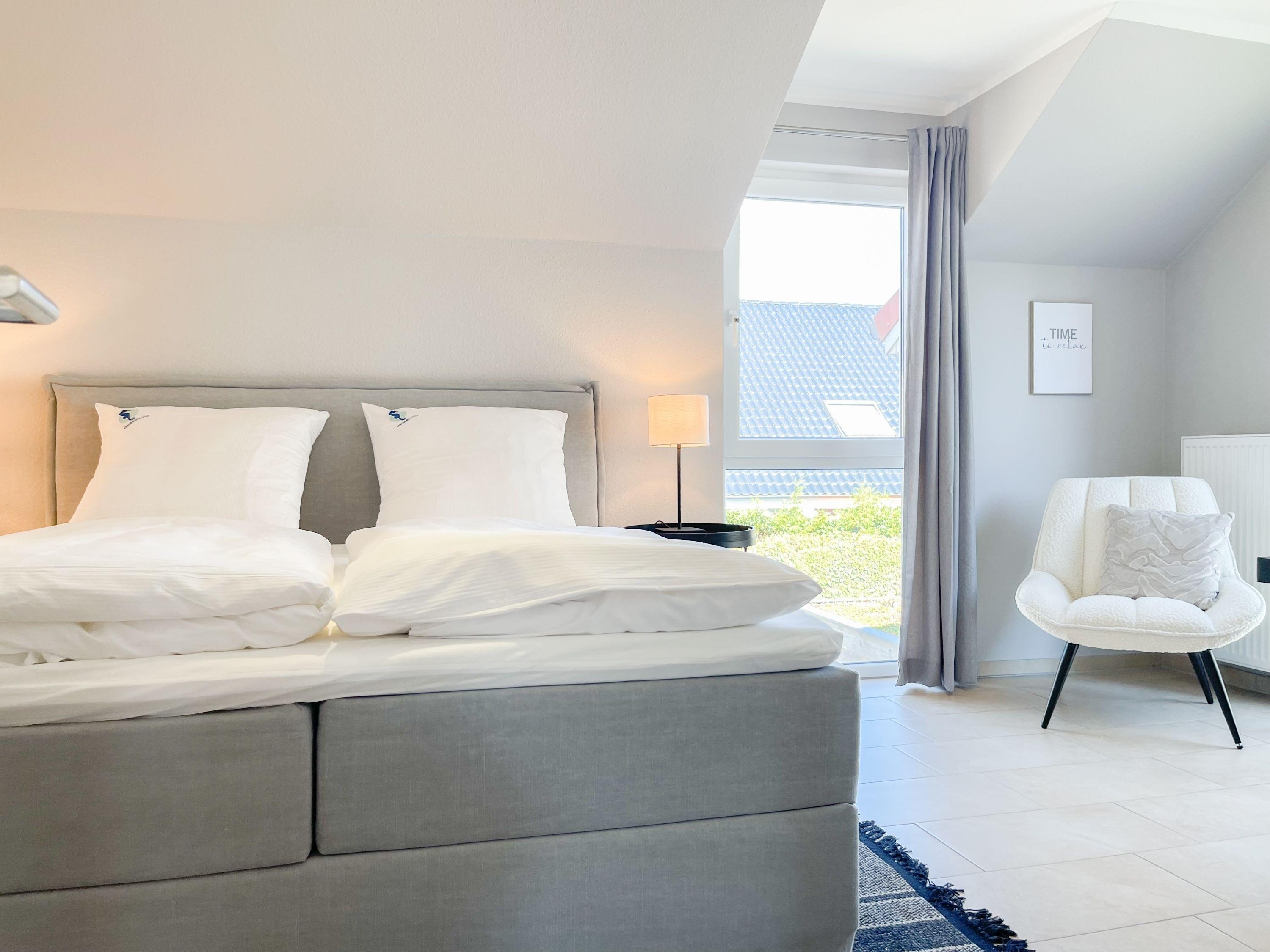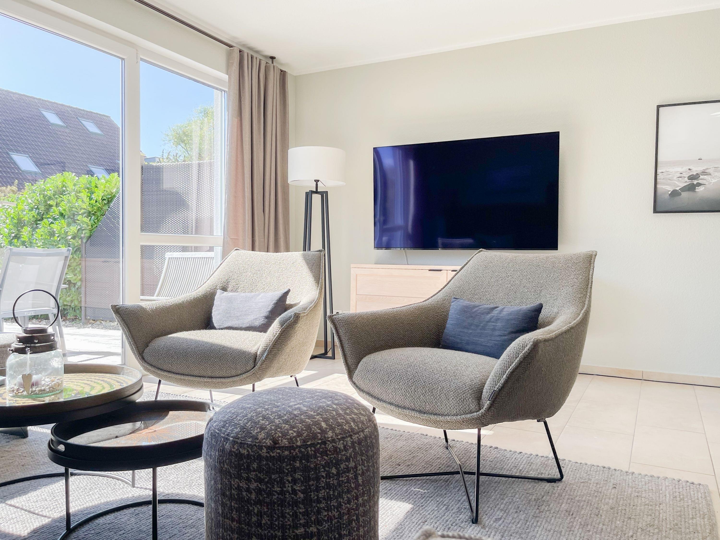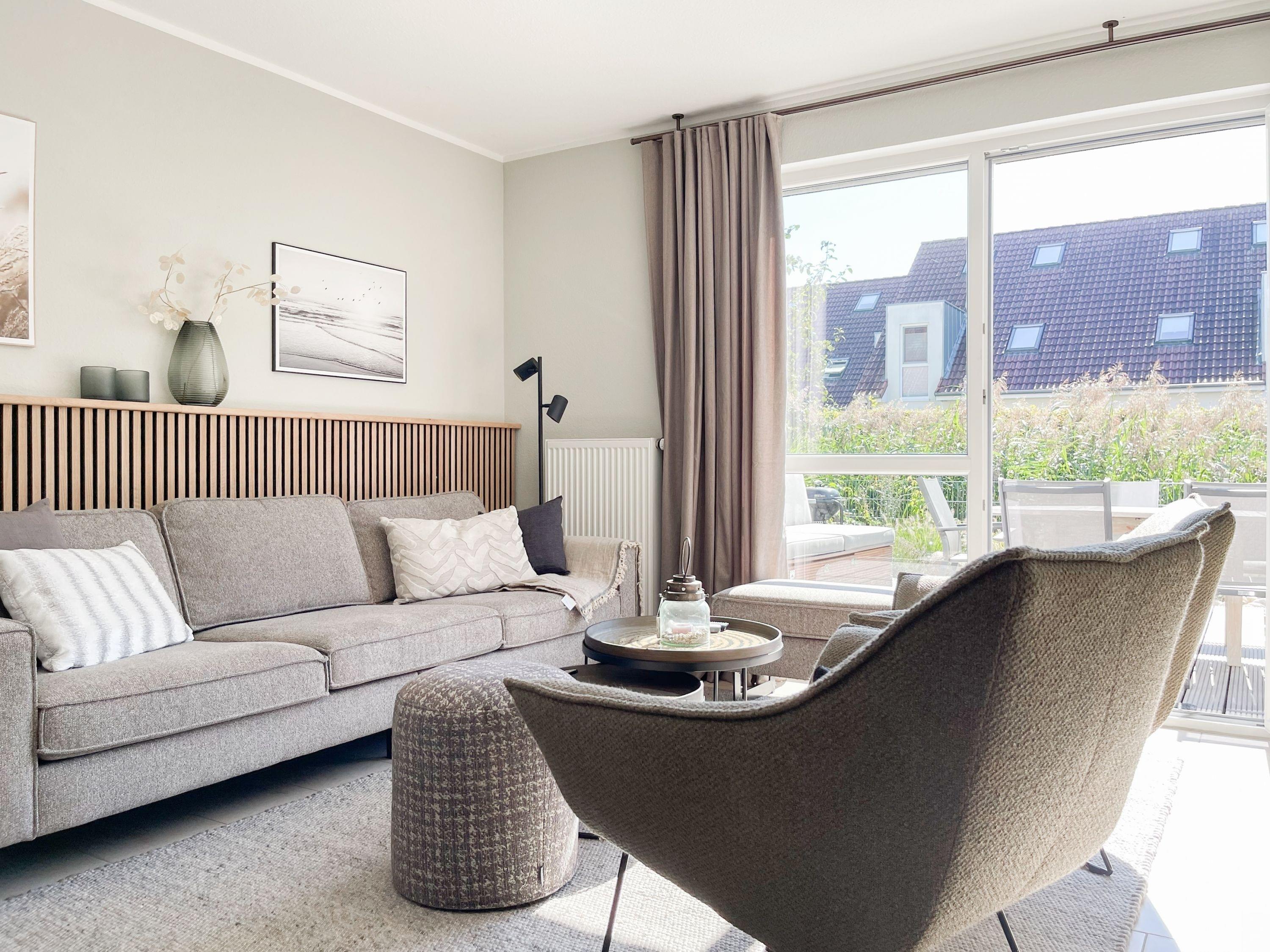 Es erwartet Sie ein exklusives Doppelhaus, das mit 3 Schlafzimmern und 2 Bädern auf über 100 qm Wohnfläche[nbsp] ausreichend Raum für 4-6 Personen bietet, um einen entspannten Ostseeurlaub in Strandnähe zu verleben. Sonnige Räumlichkeiten und die äußerst hochwertige Einrichtung im Hampton Style garantieren einen hohen Wohnstandard in einem herrlichen Ambiente. Im Erdgeschoss erwartet Sie ein großzügiger Wohnbereich, der mit einem komfortablen Sofa, Sesseln und TV eingerichtet ist. Die vorgelagerte Holz-Sonnenterrasse in Südausrichtung ist mit einer XL - Lounge und Gartenmöbeln sowie einer elektrischen Markise ausgestattet.