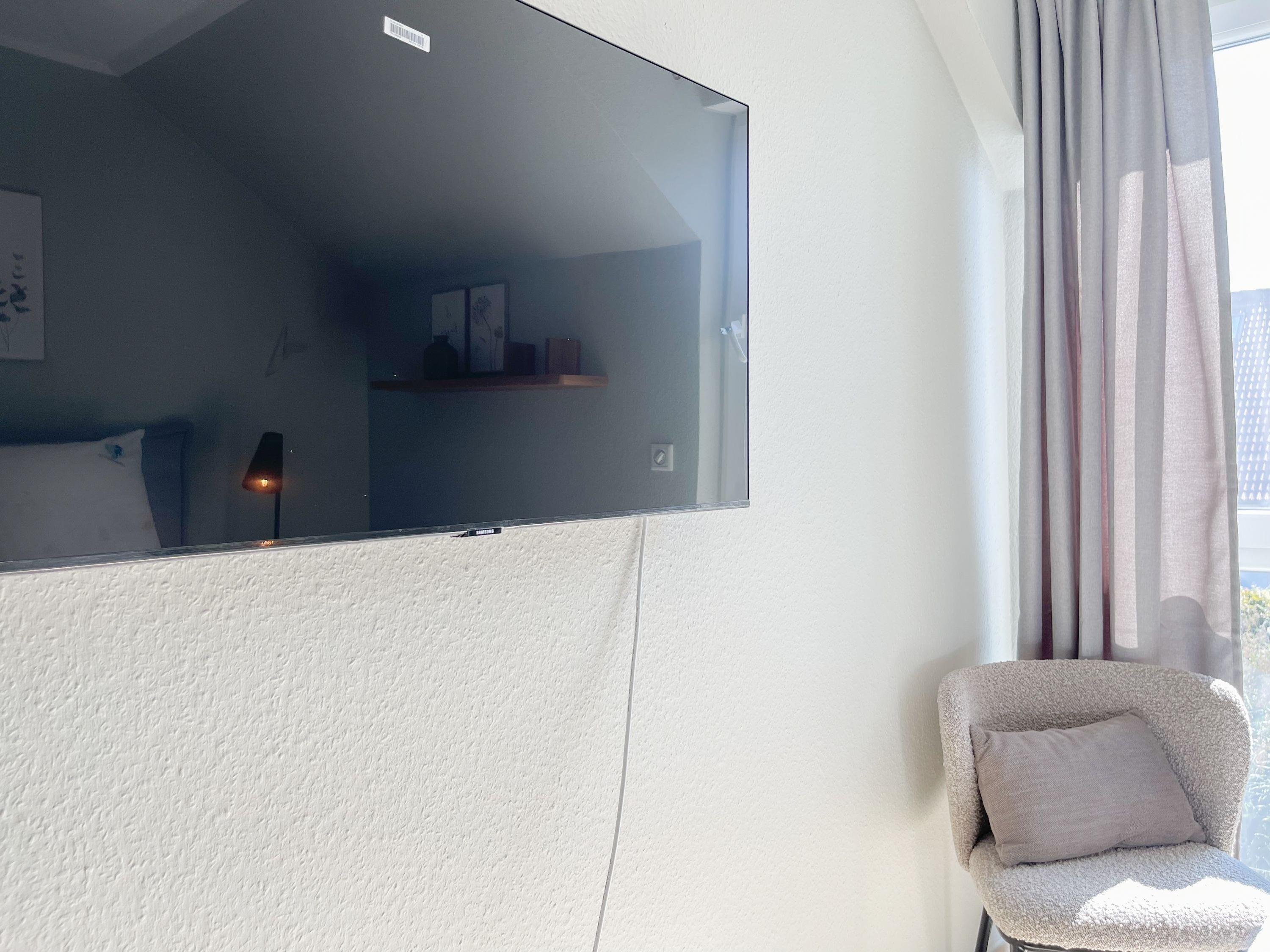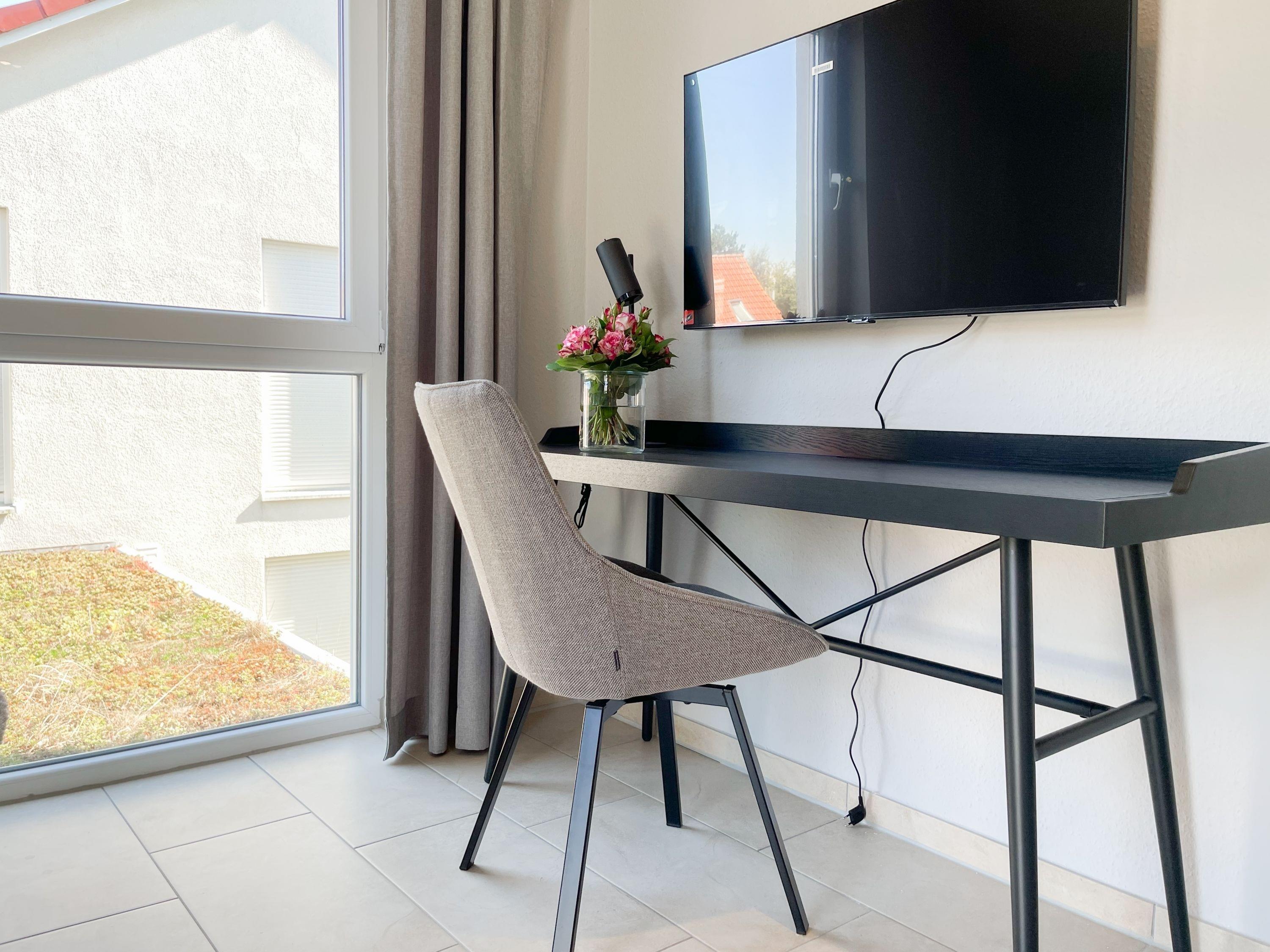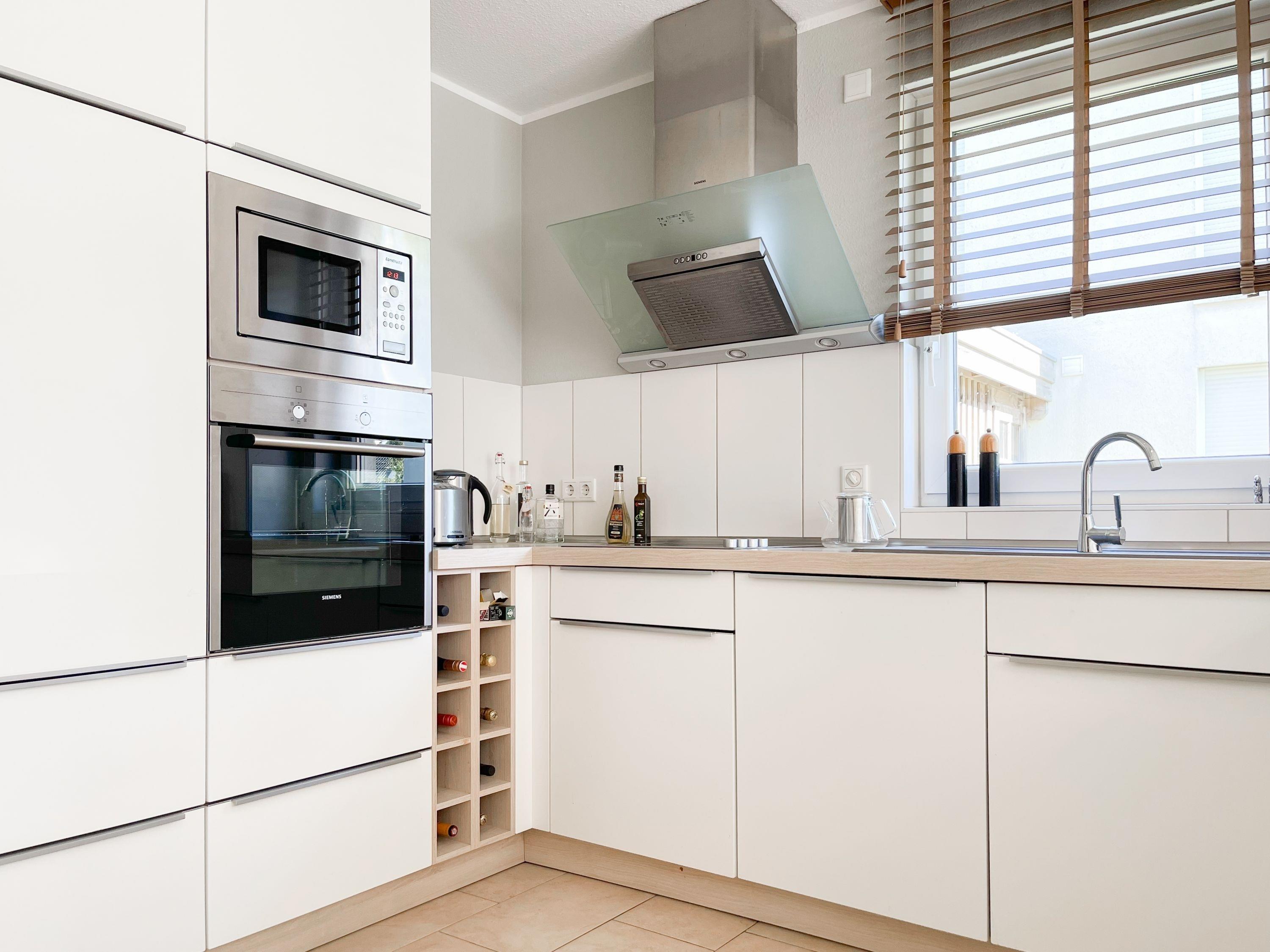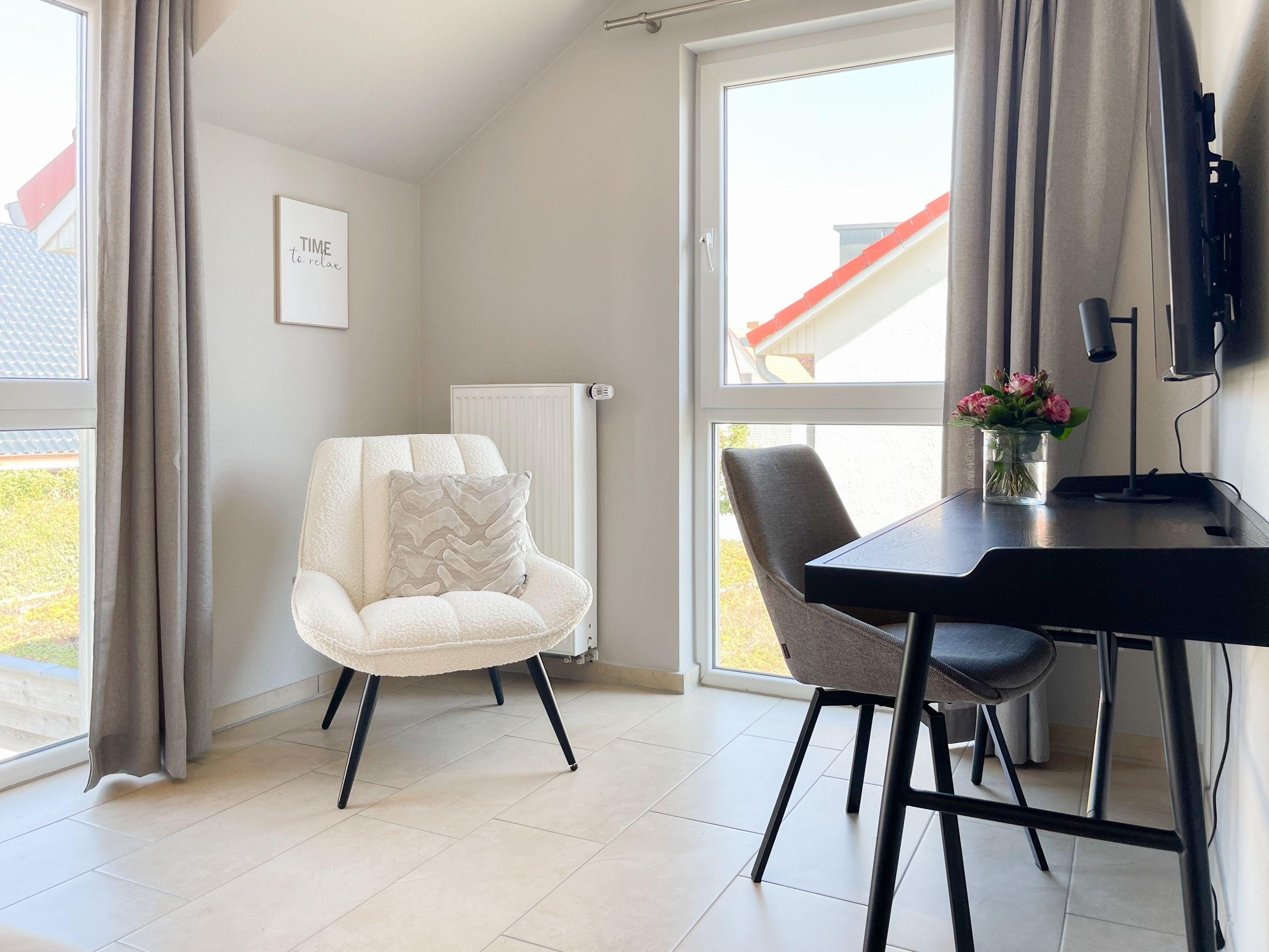 Die großzügige Einbauküche ist bestens ausgestattet und lädt zum gemeinsamen Kochen ein. Der anschließende Essbereich, mit großem Esstisch und gemütlichen Sesseln, bietet ausreichend Platz für gemeinsame Mahlzeiten und geselliges Beisammensein. Im Eingangsbereich befindet sich eine Garderobe und ein neuwertiges Tageslichtbad mit Dusche, Waschbecken und WC. Waschmaschine und Trockner sind im separaten Abstellraum untergebracht, ebenfalls im Erdgeschoss. Im Obergeschoss gibt es 2 separate Schlafzimmer (eines mit zusätzlichem Schreibtisch für das home office), die mit hochwertigen Boxspringbetten (180x200), Kleiderschränken und TV eingerichtet sind. Der dritte Raum ist als weiterer Wohnbereich mit hochwertigem Schlafsofa und Kleiderschrank gestaltet und kann sowohl als gemütlicher Rückzugsort oder als zusätzliches Schlafzimmer genutzt werden.[nbsp] Das zweite neuwertige Bad ist sehr großzügig angelegt mit Badewanne, Dusche, Waschtisch, WC, Fußbodenheizung sowie Fenster und befindet sich ebenfalls im Obergeschoss. Alle Fenster des Hauses sind mit elektrischen Außenjalousien versehen. WLAN steht selbstverständlich kostenlos zur Verfügung. Vor dem Haus befinden sich zwei Parkplätze. (1 Carport und 1 Außenstellplatz). 2-3 Fahrräder können sicher und trocken im Schuppen am Haus untergestellt werden.