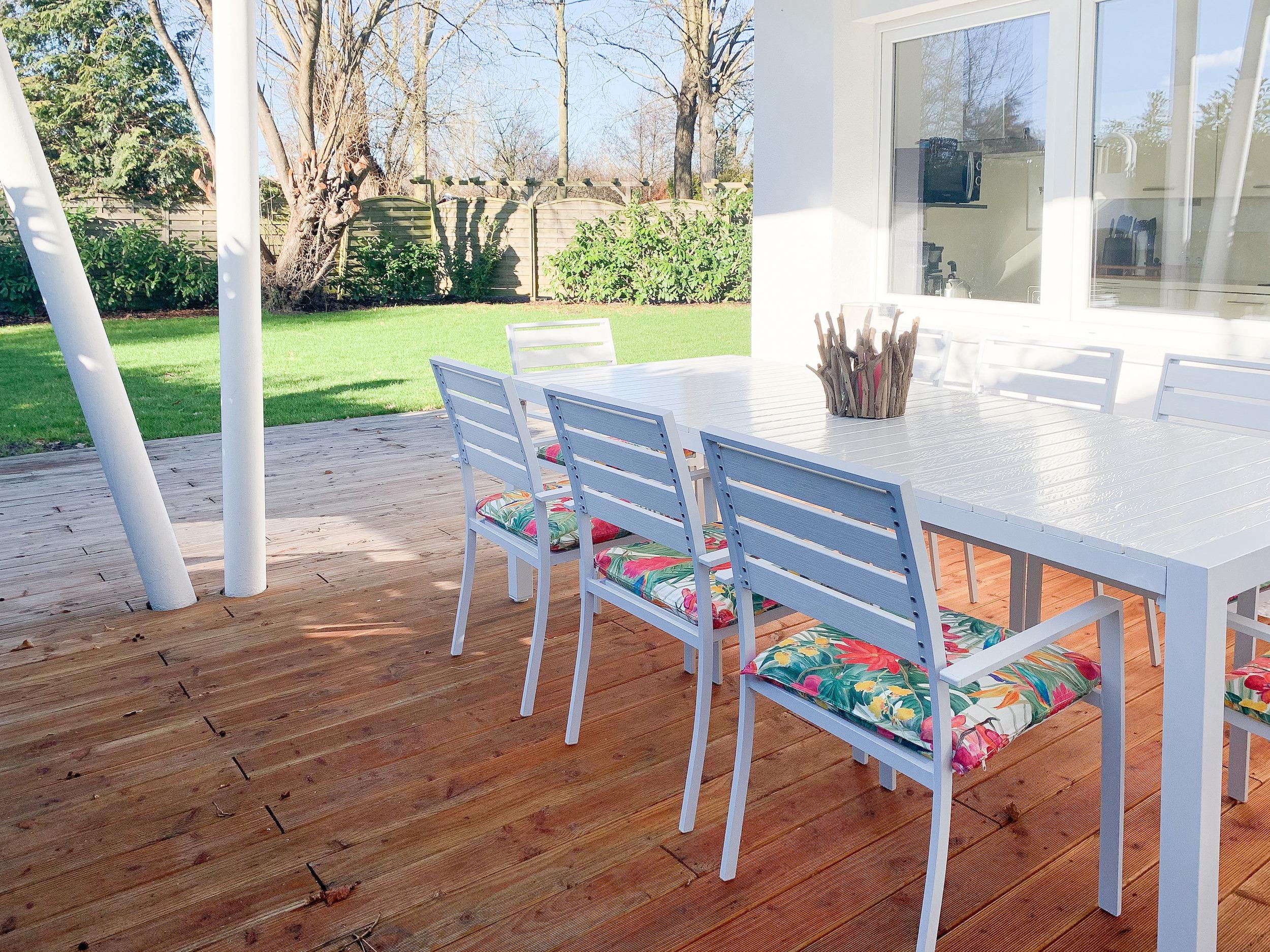 Kuscheldecken und der Infrarotheizstrahler auf der Terrasse schenken ganzjährige Freiluftmomente, auch an kühleren Tagen.