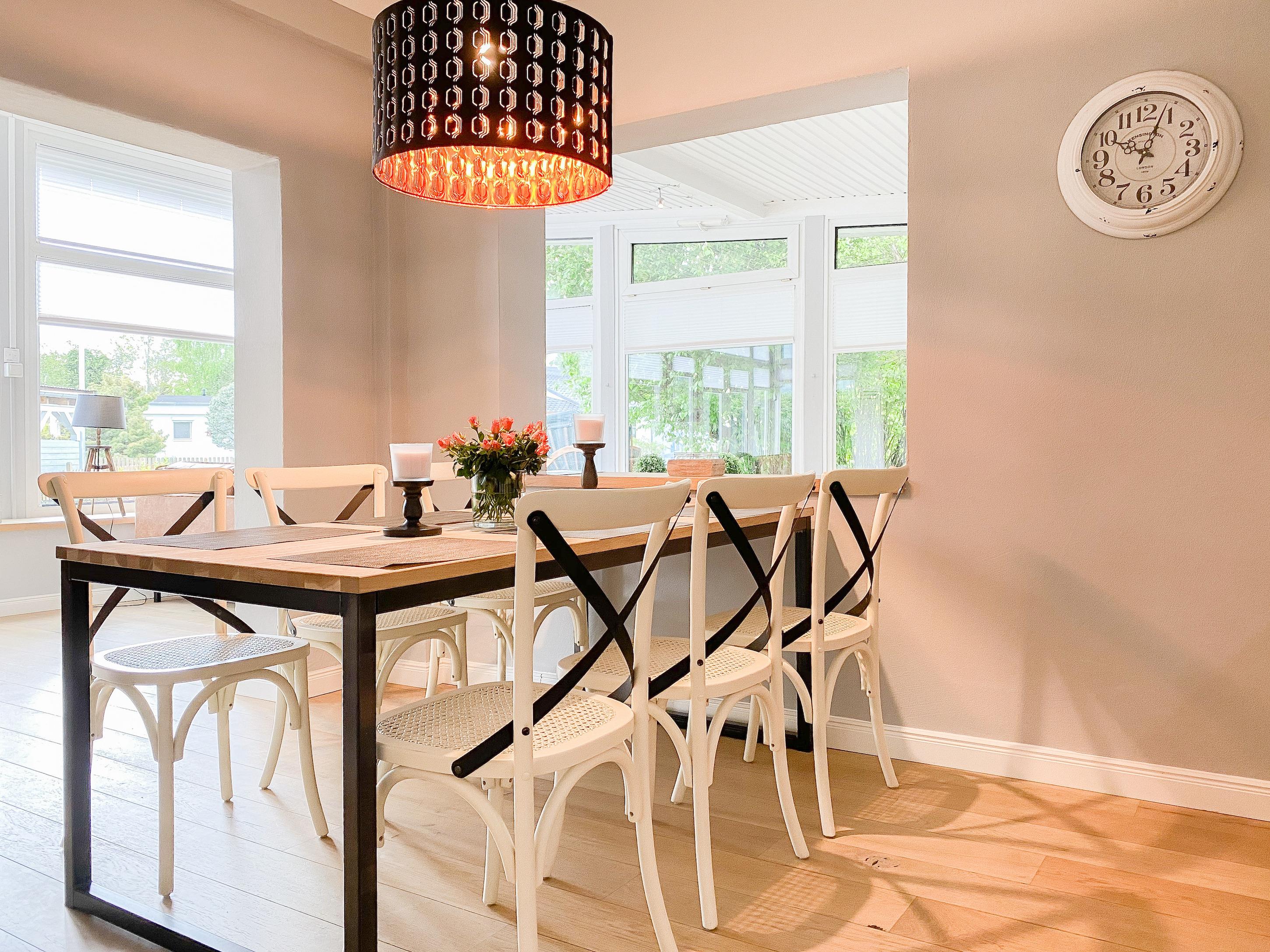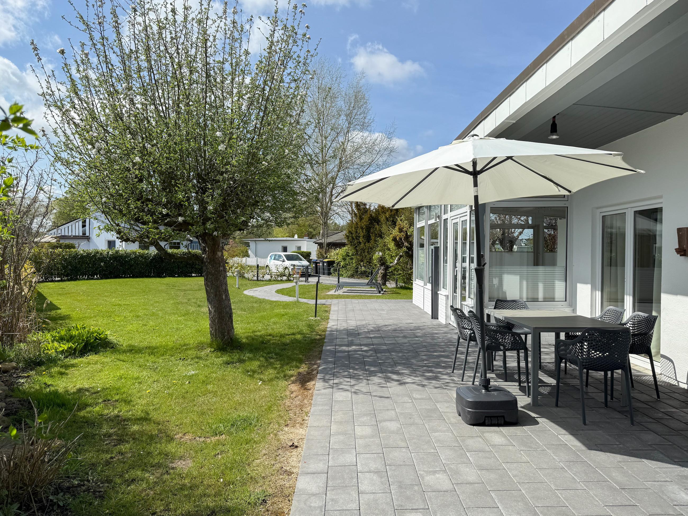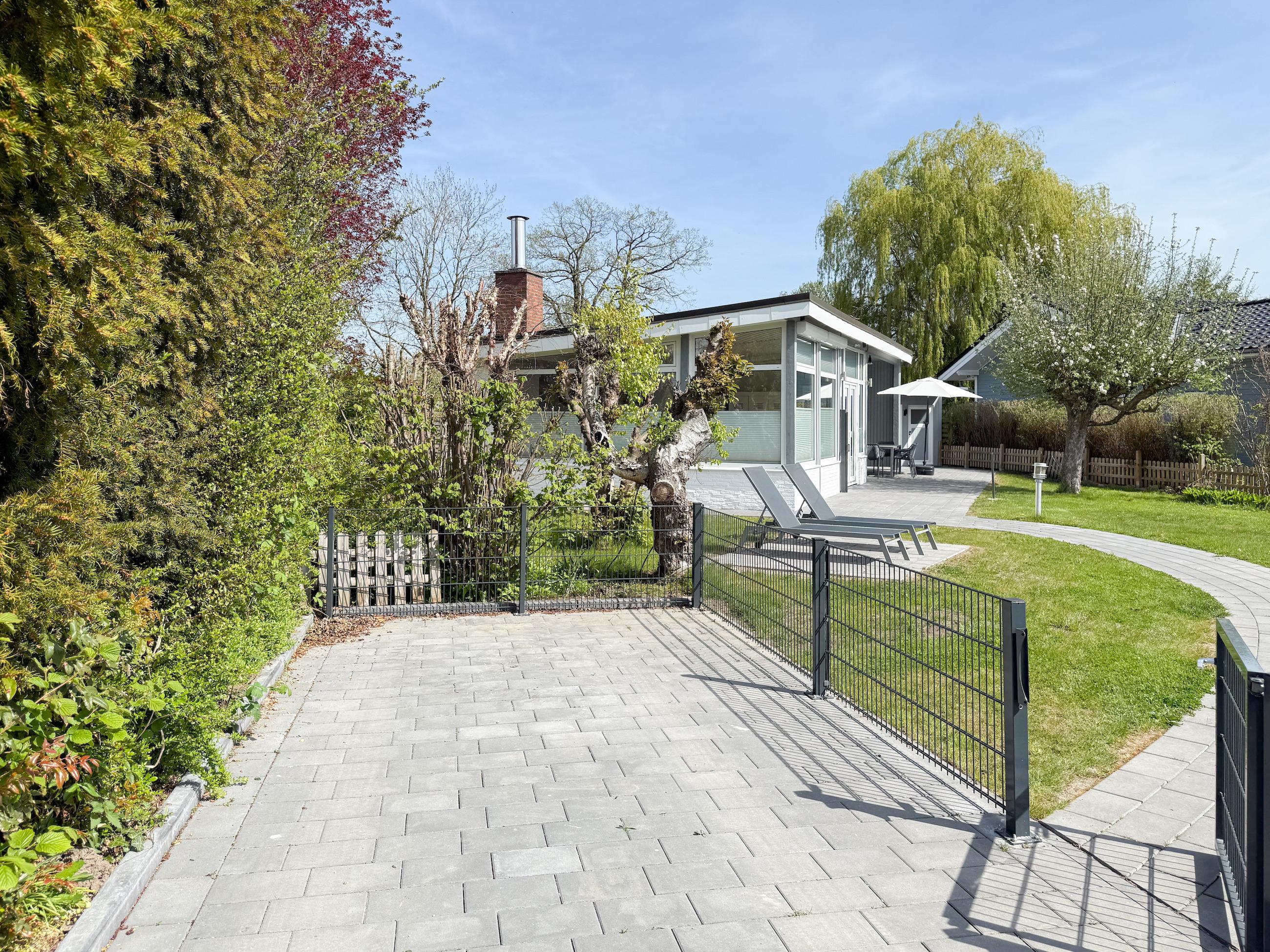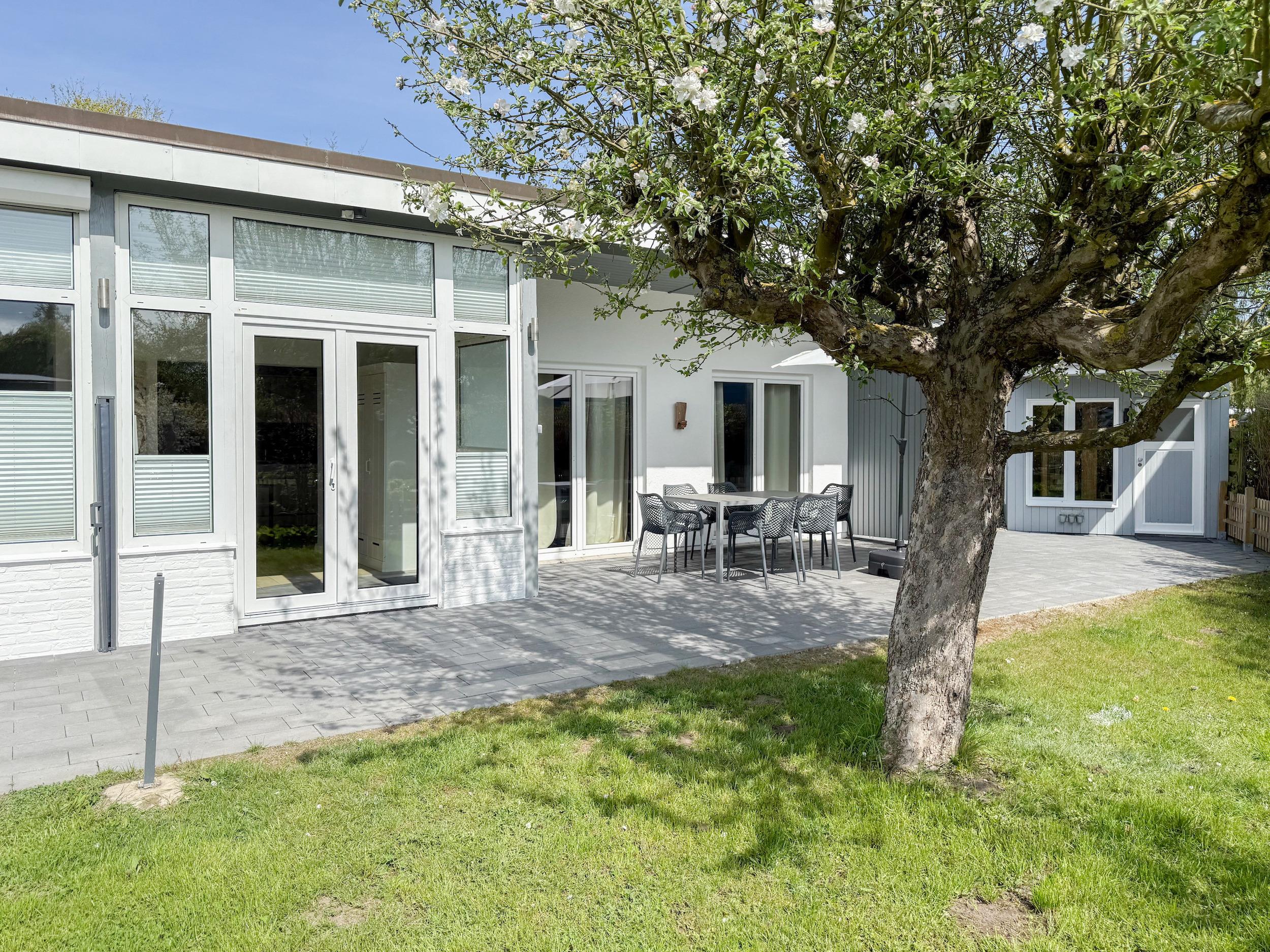 Mit circa 90 qm Wohnfläche, einem schönem eingewachsenem Garten in Südwestausrichtung, großer Terrasse und separatem Saunahaus, eignet es sich bestens für Familien und bietet ausreichend Platz für 5-6 Personen inklusive Kindern. Mittelpunkt des Hauses bildet der großzügige Wohnbereich mit riesigen Fensterflächen und wunderschönem Blick in den weitläufigen, eingezäunten Garten. Helle Räumlichkeiten, Echtholzböden und die geschmackvolle Einrichtung schaffen eine[nbsp] Atmosphäre zum Wohlfühlen. Es erwartet Sie eine hochwertige Wohnlandschaft, ein Kaminofen für gemütliche Abende und eine zeitgemäße Ausstattung wie TV, Bluetooth Lautsprecher, Radio und WLAN.[nbsp] Der großzügig angelegte Außenbereich verfügt über eine[nbsp] überdachte Terrasse in Südwest Ausrichtung mit reichlich Platz für gemütliche Stunden und einen schönen Garten mit Sonnenliegen und Gartenmöbeln. Erholung und Entspannung finden Sie im Saunahaus, das ebenfalls im Garten untergebracht ist. Die offene Einbauküche[nbsp][nbsp]ist bestens ausgestattet(Geschirrspüler, Backofen, Mikrowelle) und der integrierte Essbereich bietet ausreichend Platz für 6 Personen. Das Haus verfügt über drei[nbsp][nbsp]kleine Schlafzimmer mit Doppelbetten (160x200) und alle [nbsp]Fenster sind mit Plissees und Verdunkelungsvorhängen/Rollos versehen. Ein Schlafzimmer ist zusätzlich mit einem TV ausgestattet und verfügt über ein modernes Duschbad ensuite.[nbsp] Das zweite Duschbad ist über den Flur zu erreichen. Der vorhandene Stauraum für die Urlaubsgarderobe ist in zwei Schlafzimmern relativ gering.