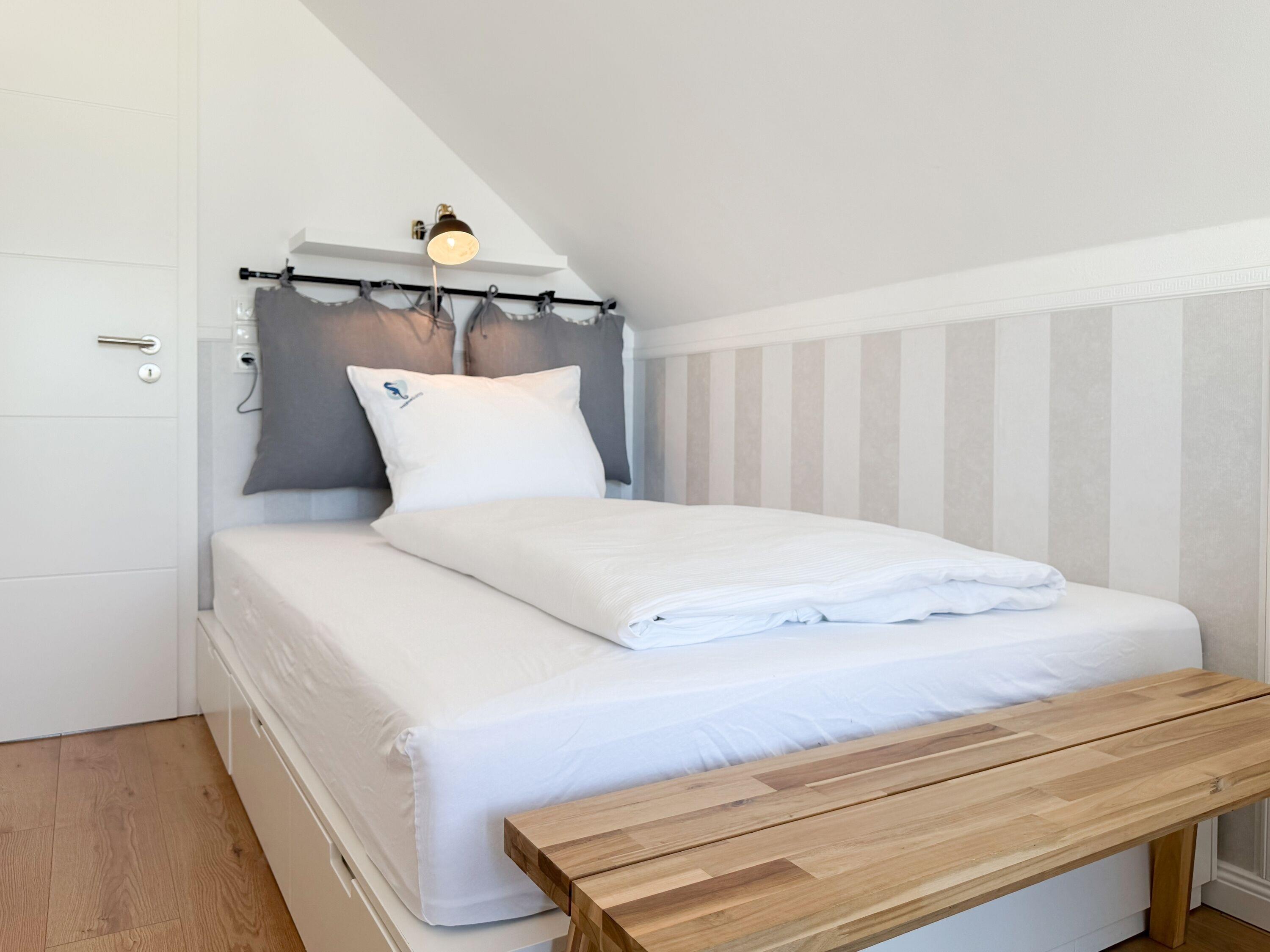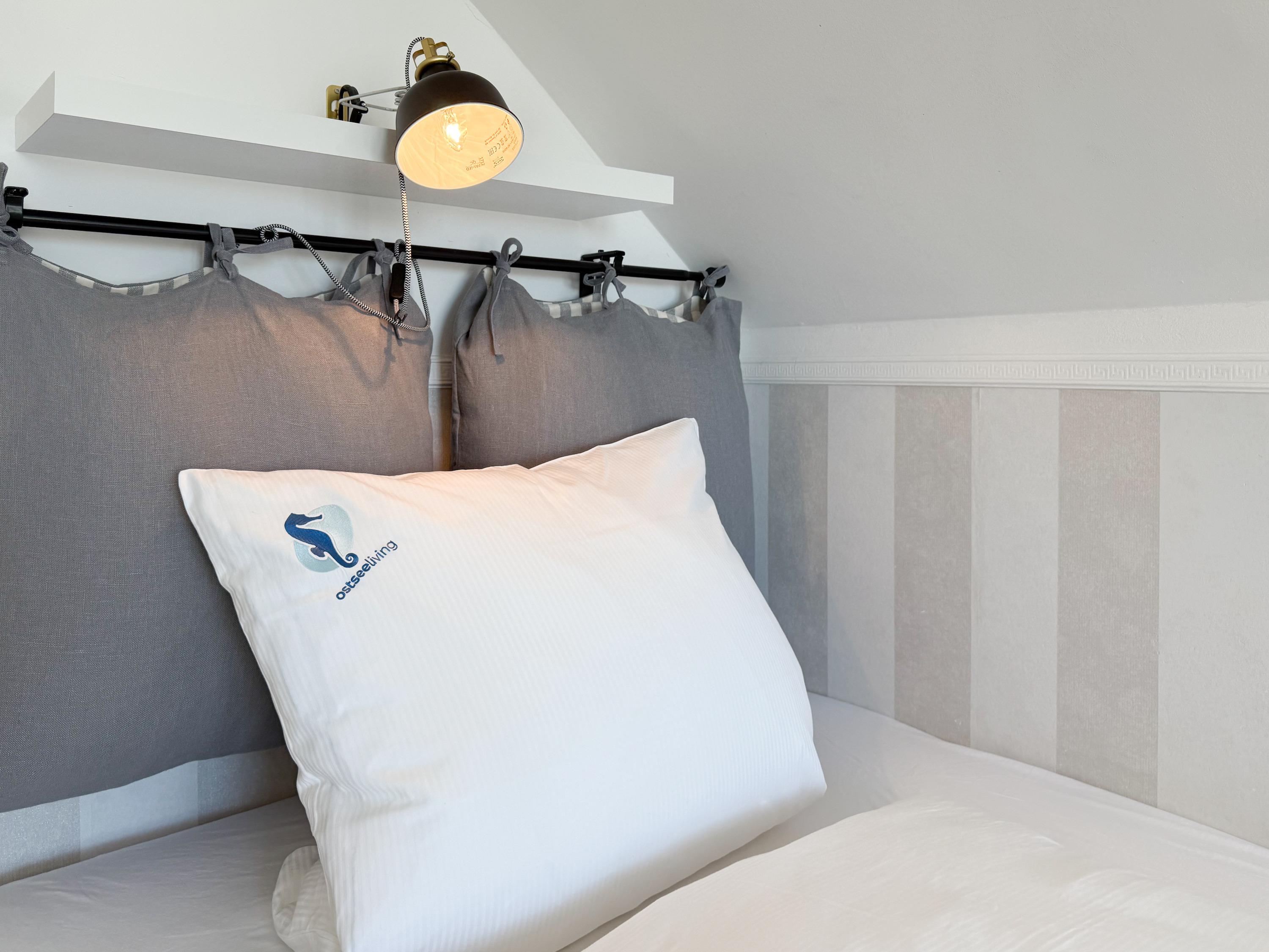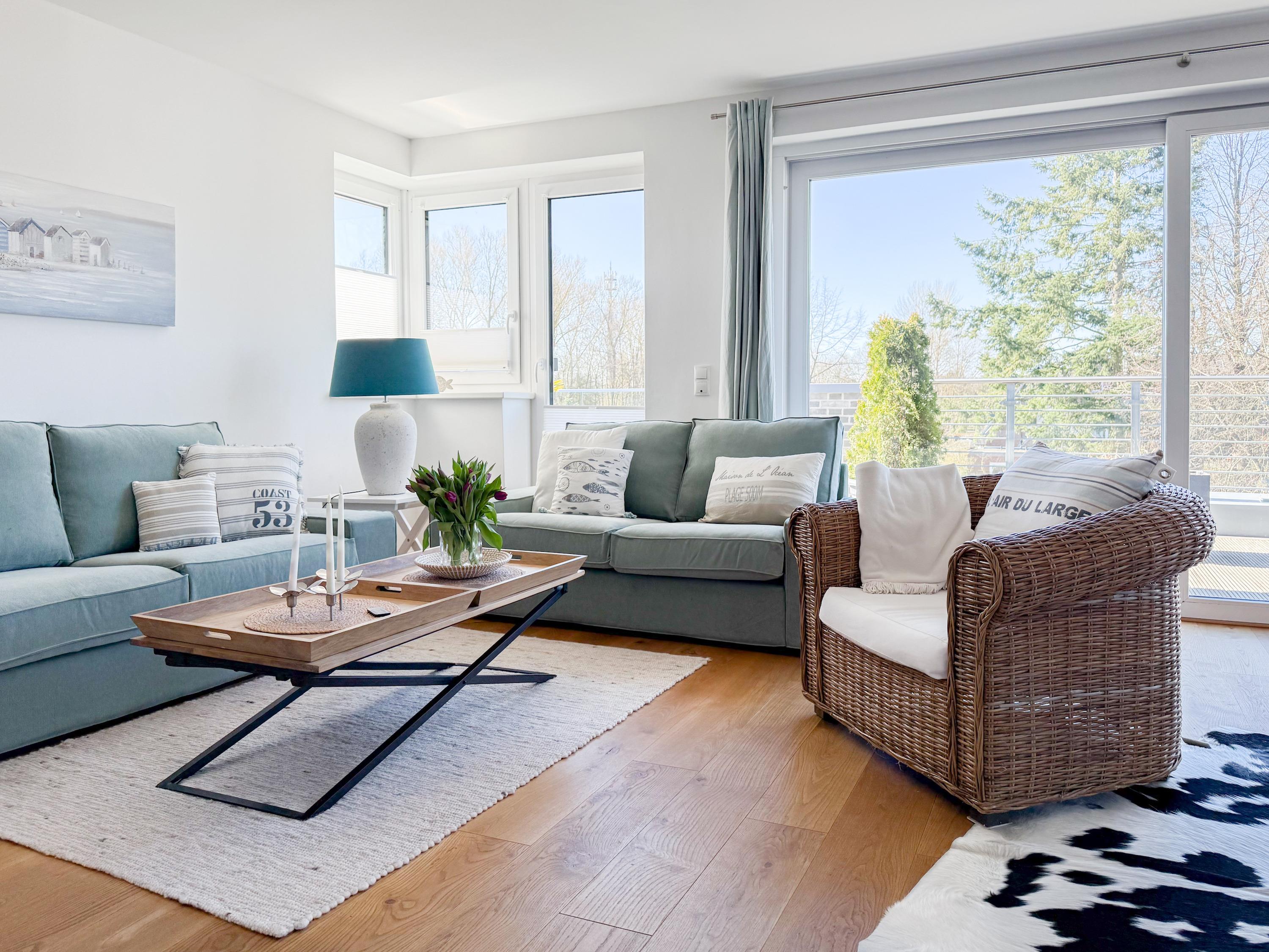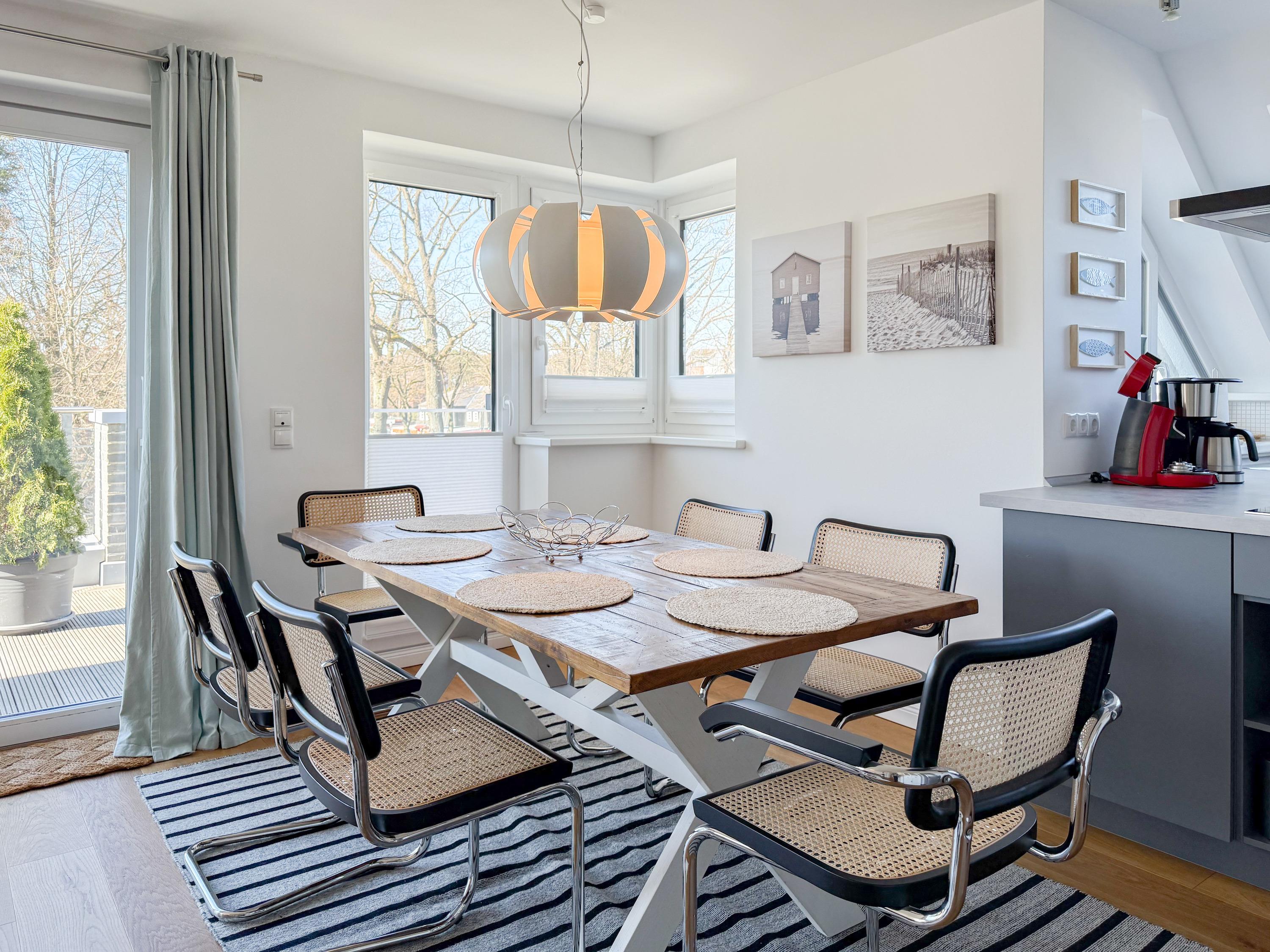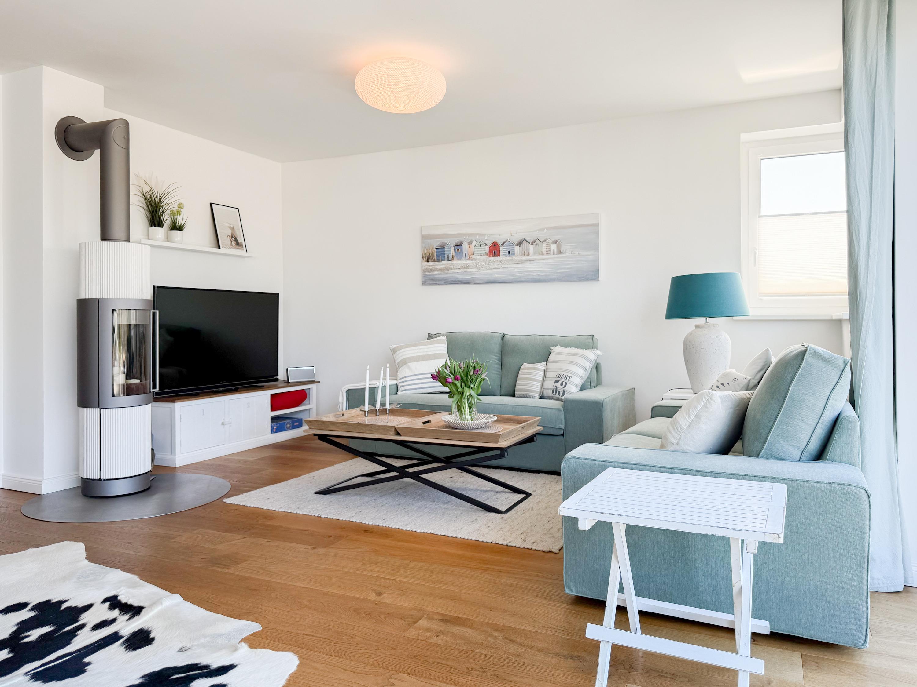 Das Penthouse ist hochwertig eingerichtet und bestens ausgestattet. Große, bodentiefe Fensterflächen durchfluten die Räumlichkeiten mit Tageslicht und sorgen für ein angenehmes Wohlfühlambiente – ideal für einen entspannten Ostseeurlaub. Ein besonderes Highlight ist die großzügige, über 50 m² große Dachterrasse in Südwestausrichtung. Hier lassen sich die frische Meeresluft und den Hafenblick genießen – ob auf den Sonnenliegen, an den Gartenmöbeln oder im Schatten der elektrischen Markise. Der offene Wohn- und Essbereich bietet viel Platz für gesellige Stunden. Ein Kaminofen (Holz nicht inklusive) sorgt für eine gemütliche Atmosphäre, und die moderne Einbauküche mit Kochinsel ist mit allen wichtigen Geräten ausgestattet – perfekt für alle, die gerne gemeinsam kochen. Auf der unteren Wohnebene befindet sich eines der beiden stilvollen Bäder mit Dusche und Waschtisch sowie eine Sauna mit Blick ins Grüne. Die obere Ebene beherbergt zwei separate Schlafzimmer mit Doppelbetten (180x200 und 140x200 plus Schlafsessel), Verdunkelungsvorhängen und TV. Das kleine Schlafzimmer punktet mit einem tollen Blick auf den Hafen. Ein weiteres Badezimmer mit Badewanne rundet den Komfort ab. Das Penthouse bietet auf über 100 m² einen herrlichen Rückzugsort für 2-4 Personen mit der ganz besonderen Atmosphäre des Hafens.