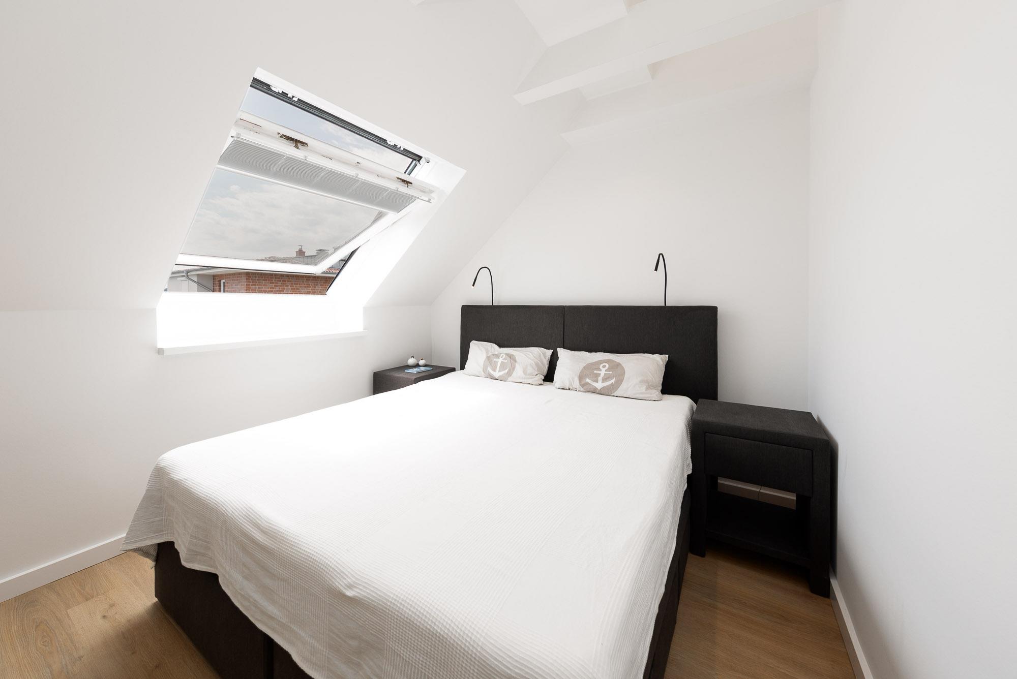 Über die große Treppe gelangen Sie ins Obergeschoss der Ferienwohnung, dort finden Sie zwei Schlafzimmer vor. Das erste Schlafzimmer verfügt über ein hochwertiges Boxspringbett (180x200cm) und einen zusätzlichen Flatscreen-TV. Das Fenster lässt sich mit Hilfe eins Verdunklungs-Plissees abdunkeln.