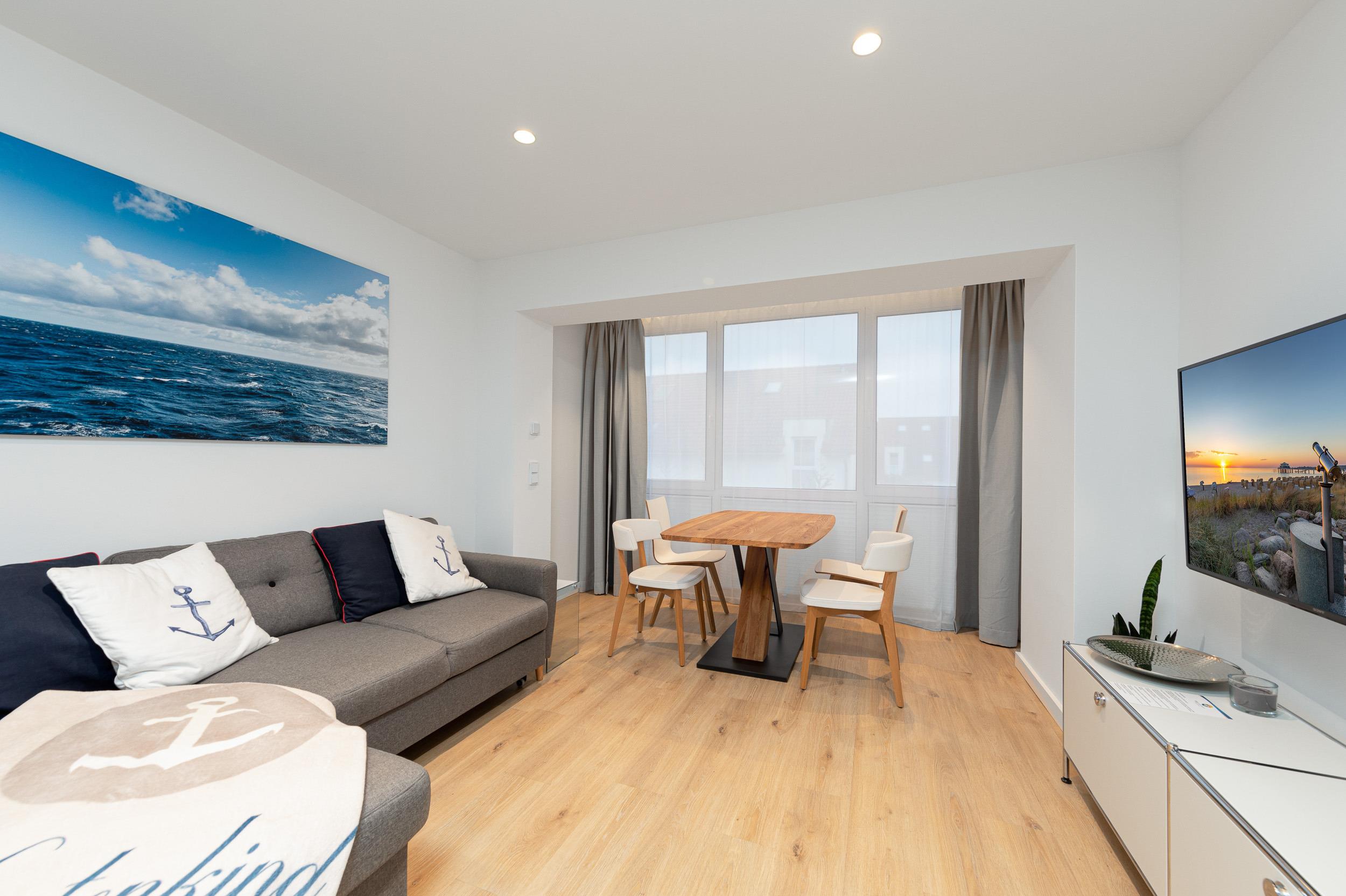Von der offenen Küche aus gelangen Sie in das freundliche und einladende Wohnzimmer mit Essecke, Couchgarnitur, Flatscreen-TV und Internet-Radio. Das Wohnzimmer mit Wohlfühlfaktor lädt mit seiner komfortablen Couchgarnitur zum Entspannen und Relaxen ein. Ein Flatscreen-TV bietet Ihnen auch bei typisch norddeutschem Schietwetter Unterhaltung. Neben dem Eingangsbereich finden Sie zudem ein kleines Gäste-WC mit Handwaschbecken und WC vor.