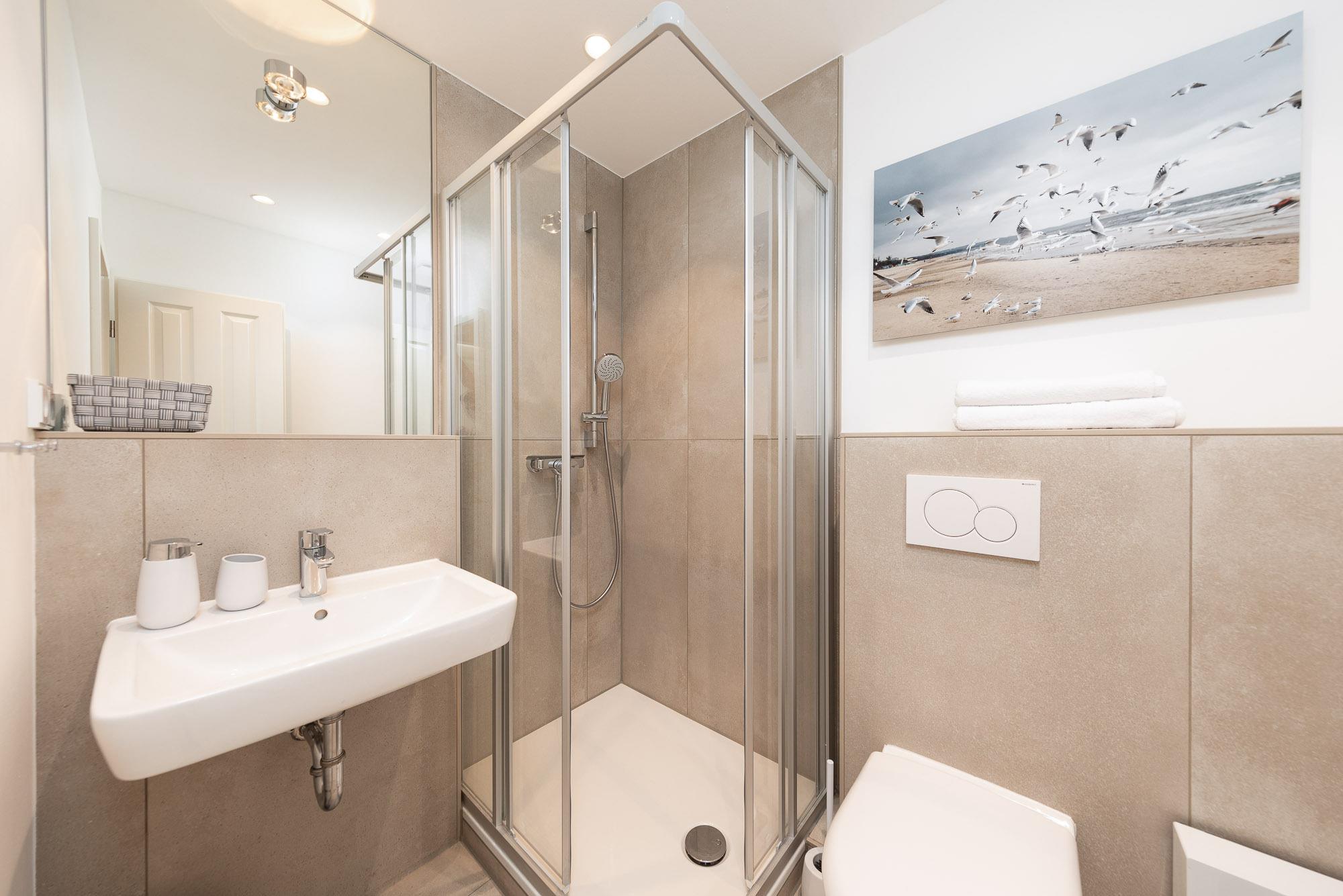 In dem Badezimmer im Obergeschoss steht Ihnen eine Dusche mit Glasverkleidung, ein WC sowie ein Waschtisch und ein Spiegel zur Verfügung.