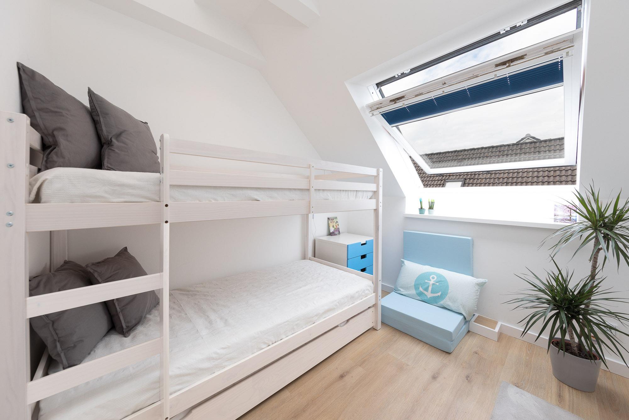 Das zweite Schlafzimmer verfügt über ein Etagenbett (je 90x200cm), die untere Liegefläche lässt sich wie bei einem Tandembett ebenso um 90x200cm ausziehen. Das Fenster in dem zweiten Schlafzimmer verfügt über ein Verdunklungs-Plissee.