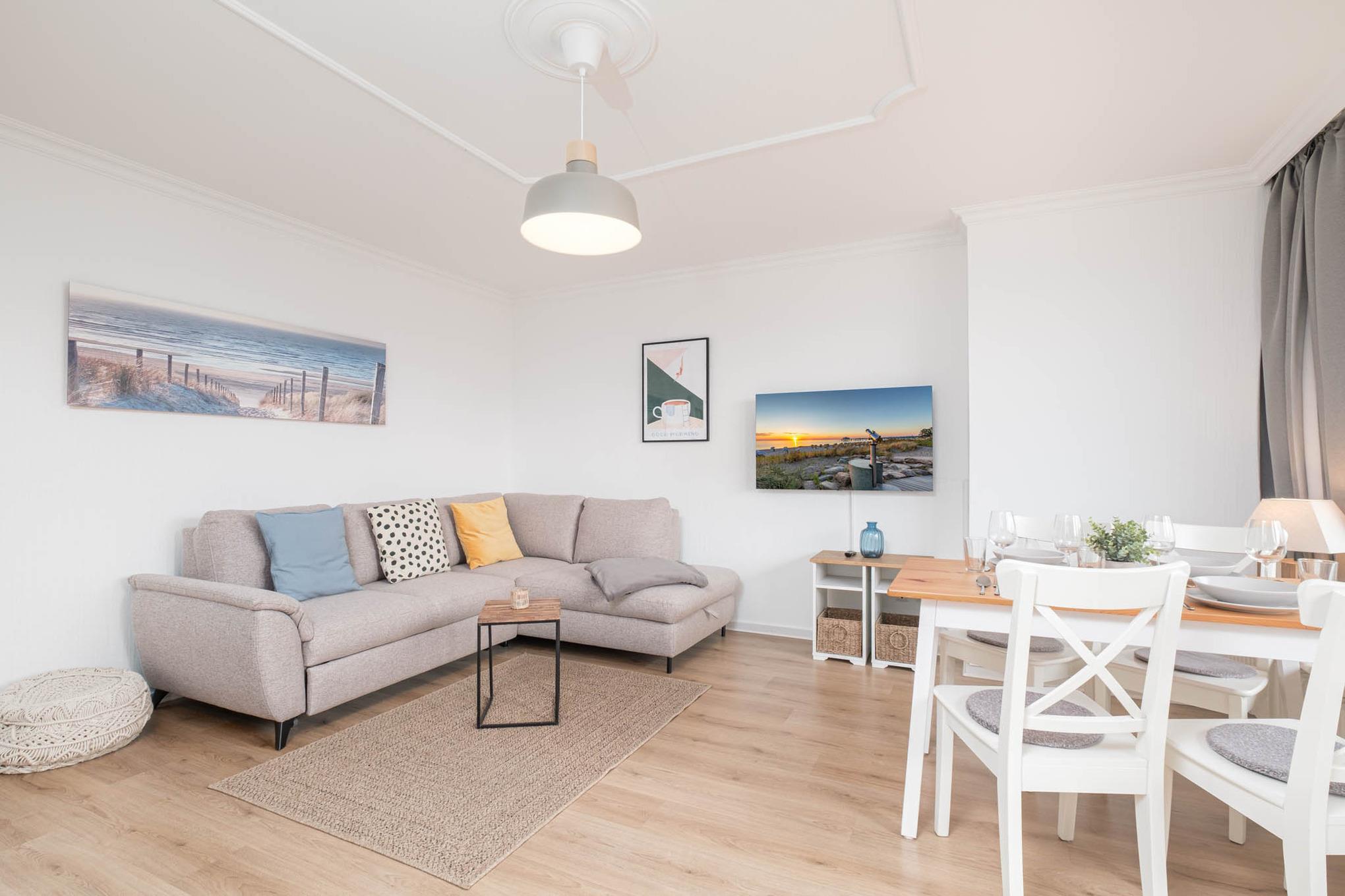 Das Wohnzimmer verfügt über einen gemütlichen Couchbereich mit Schlaffunktion (140x200cm), Flatscreen-TV, einem gemütlichen Essbereich sowie eine offene Wohnküche mit u.a. Cerankochfeld, Backofen und Geschirrspüler.