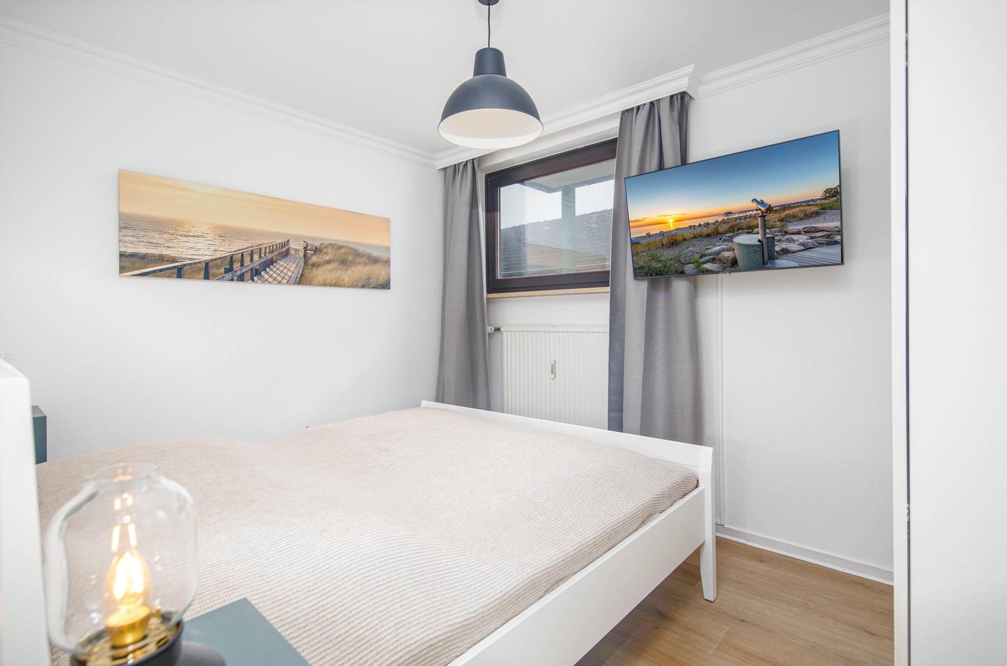 Das separate Schlafzimmer der Niendorf Ferienwohnung ist mit einem Doppelbett (180 x 200 cm) und einem Kleiderschrank ausgestattet. Zudem erwartet Sie hier ein zusätzlicher TV, der nur über Magenta TV läuft.