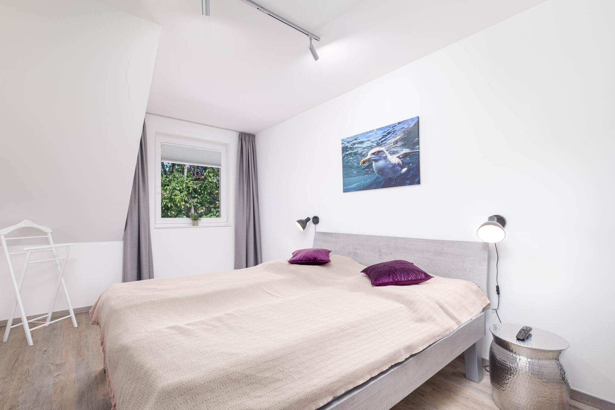 Auch das Schlafzimmer I mit komfortablem Doppelbett (1,80 x 2,00m, getrennte Matratzen) und Kleiderschrank befindet sich im Erdgeschoss.