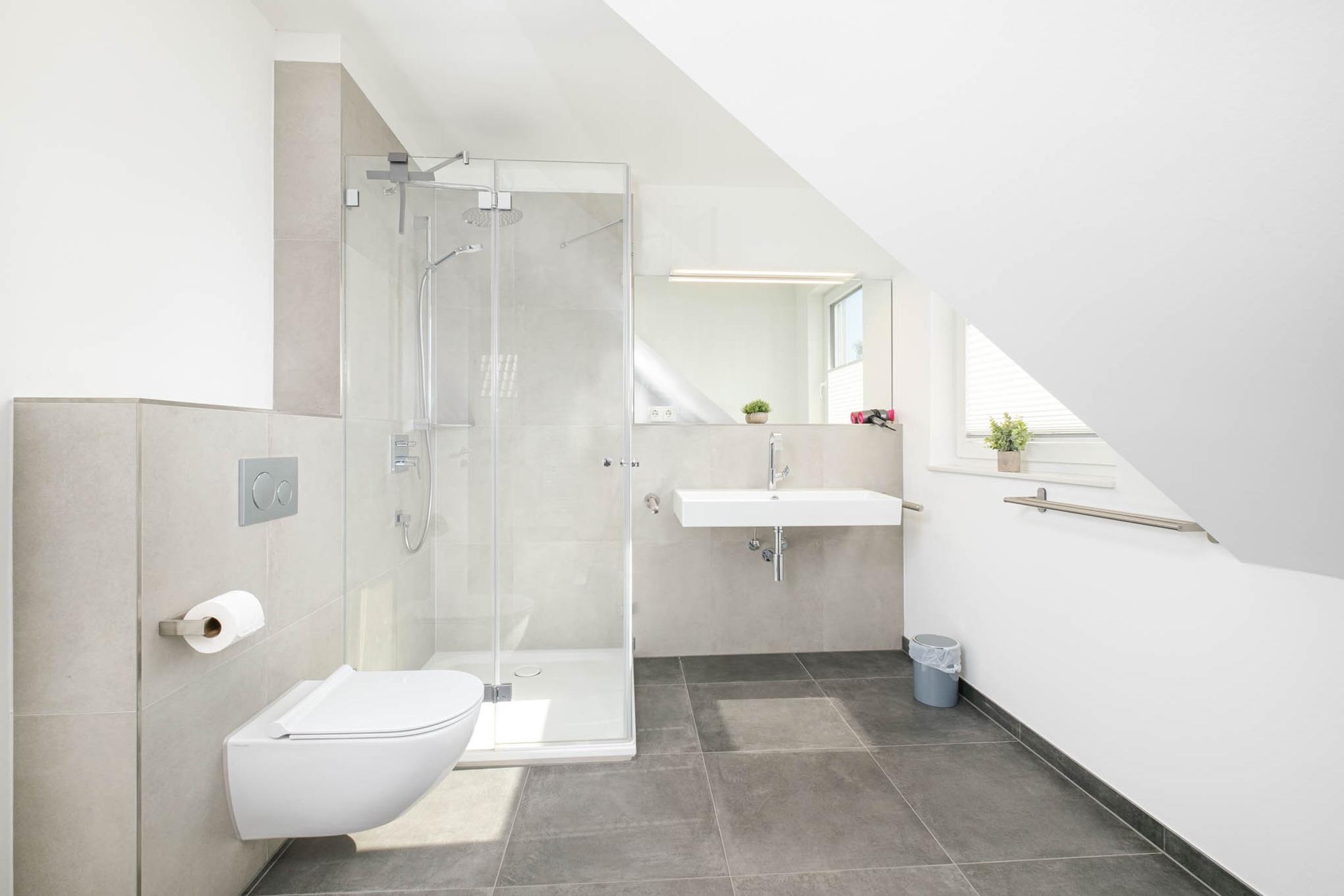 Auf dieser Wohnebene geht vom Flur zudem das Badezimmer I mit WC, Dusche, Waschmaschine, Wäscheständer und Handtuchtrockner ab.