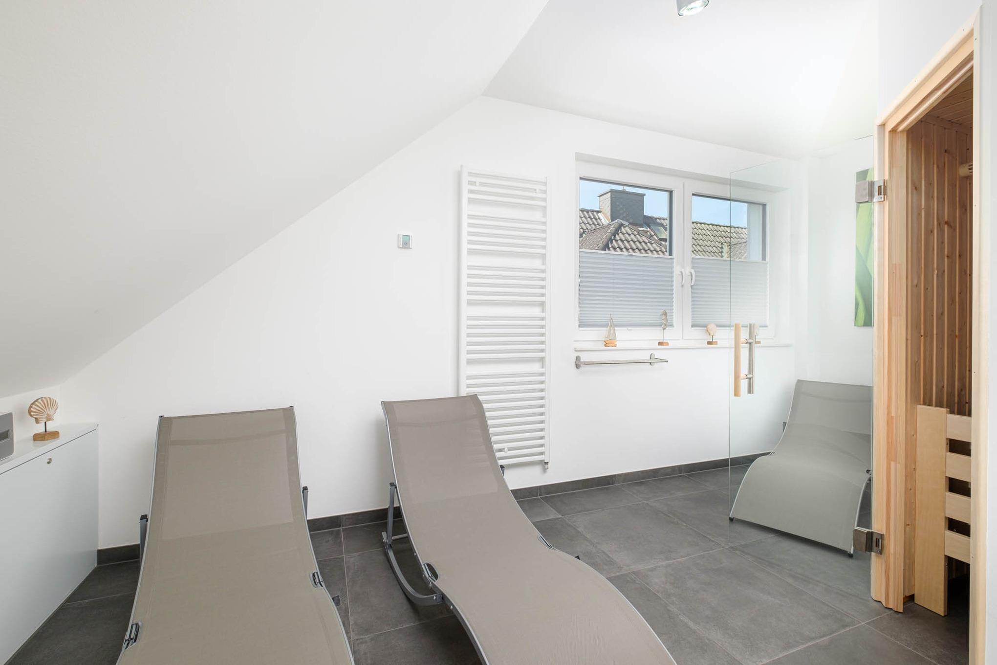 Insbesondere an kalten Wintertagen oder für die Extraportion Wellness finden Sie auf diesem Stockwerk das großzügige Badezimmer II vor. Mit einem WC, einer Dusche, drei Liegen sowie der Sauna als absolutes Highlight, lässt Ihnen dieses Ostseedomizil gar keine andere Möglichkeit, als sich pudelwohl zu fühlen!