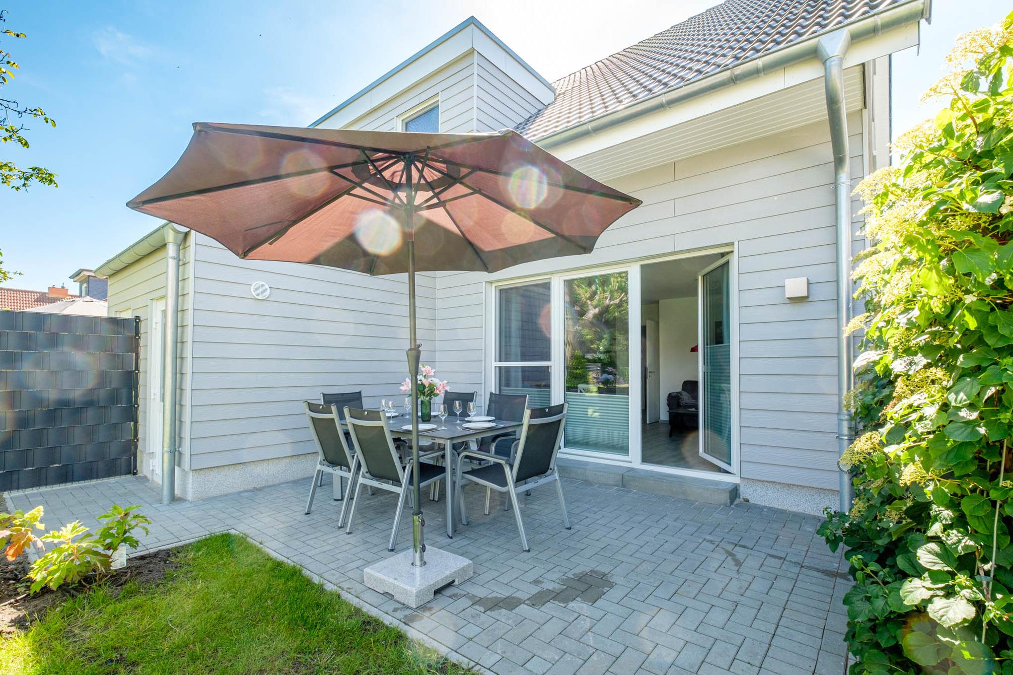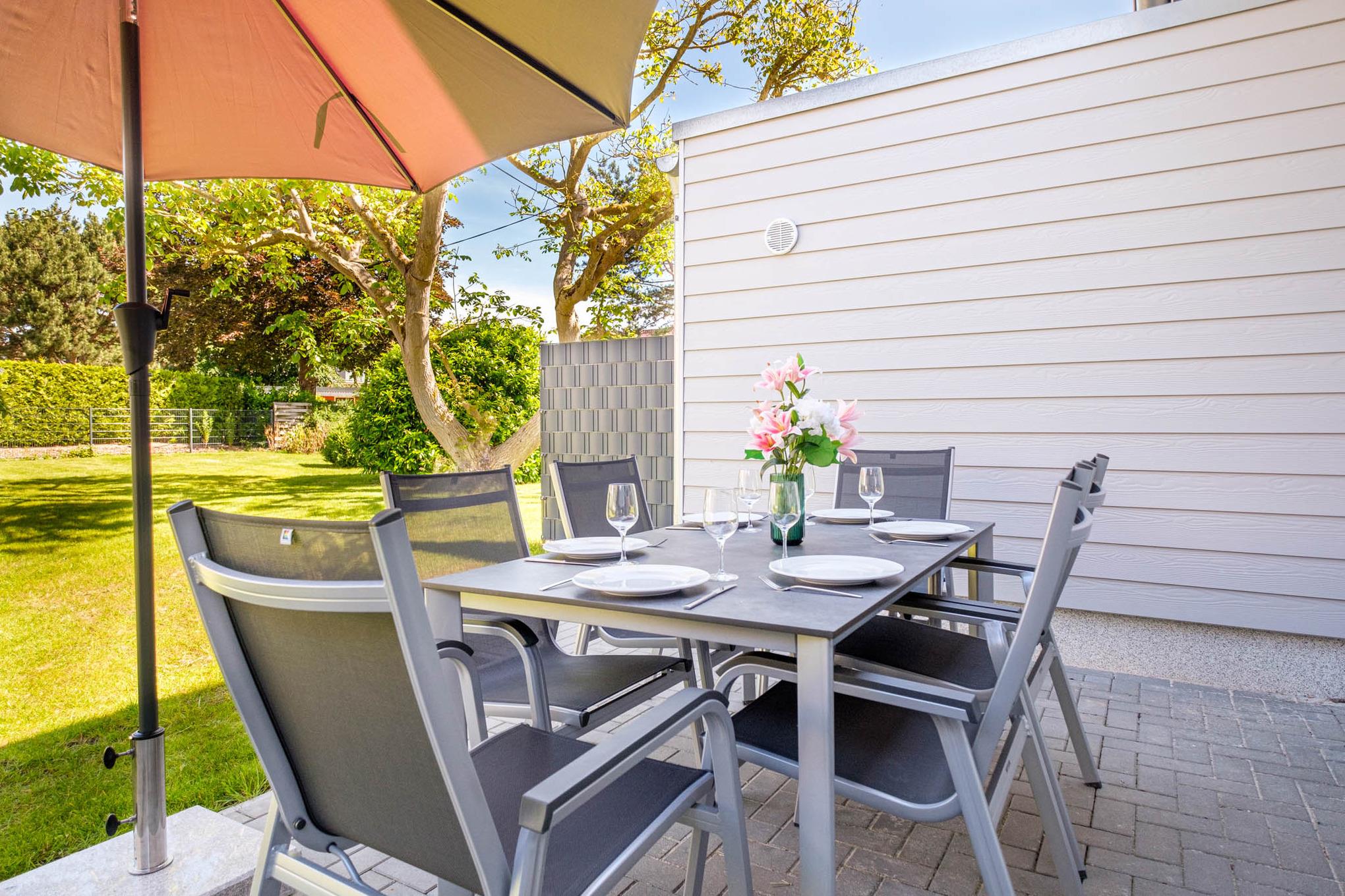 Abgerundet wird dieses geschmackvoll eingerichtete Traumdomizil durch die dem Wohnbereich angeschlossene Terrasse in Ausrichtung Nord/Nord-West mit Zugang zum Garten, den Sie sich mit der benachbarten Doppelhaushälfte "Bude B" teilen. Gönnen Sie sich am Morgen einen Moment bei einer Tasse Kaffee und atmen Sie ein wenig frische Ostseeluft. Während sich die Kinder im Garten rund um den schönen Nussbaum austoben, tanken Sie neue Energie und genießen den Moment für sich.