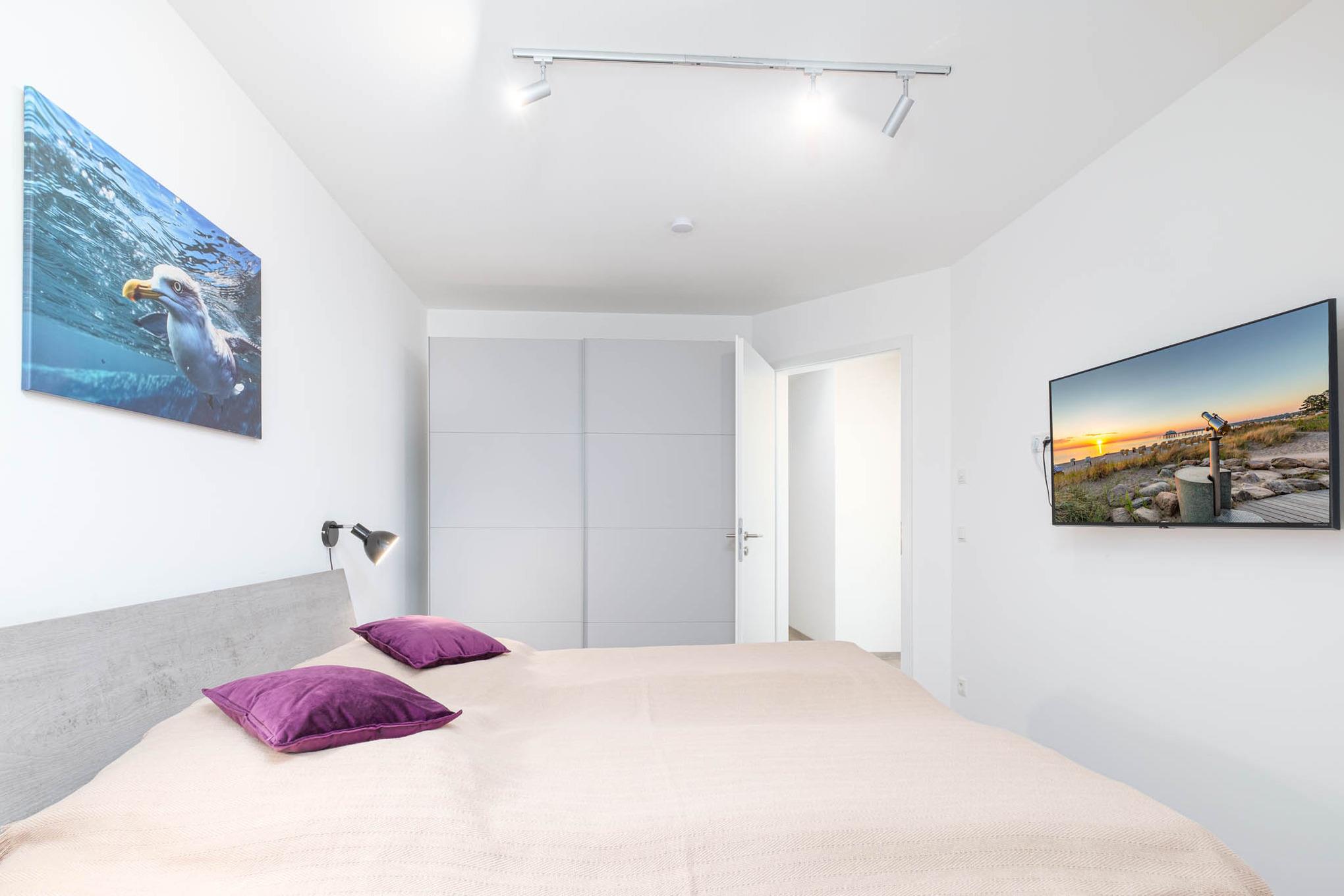 Eine Etage höher - im 1. Obergeschoss - sind das Schlafzimmer II und III gelegen. Beide bieten Ihnen für den wohlverdienten Erholungsschlaf, wie auch das Schlafzimmer I, je ein Doppelbett (1,80 x 2,00m, getrennte Matratzen) sowie einen weiteren TV und in Form von großen Kleiderschränken eine Möglichkeit, Ihr Reisegepäck ordentlich zu verstauen.