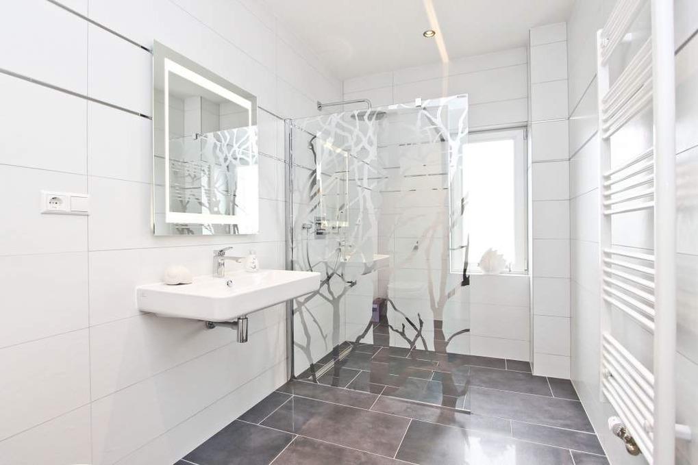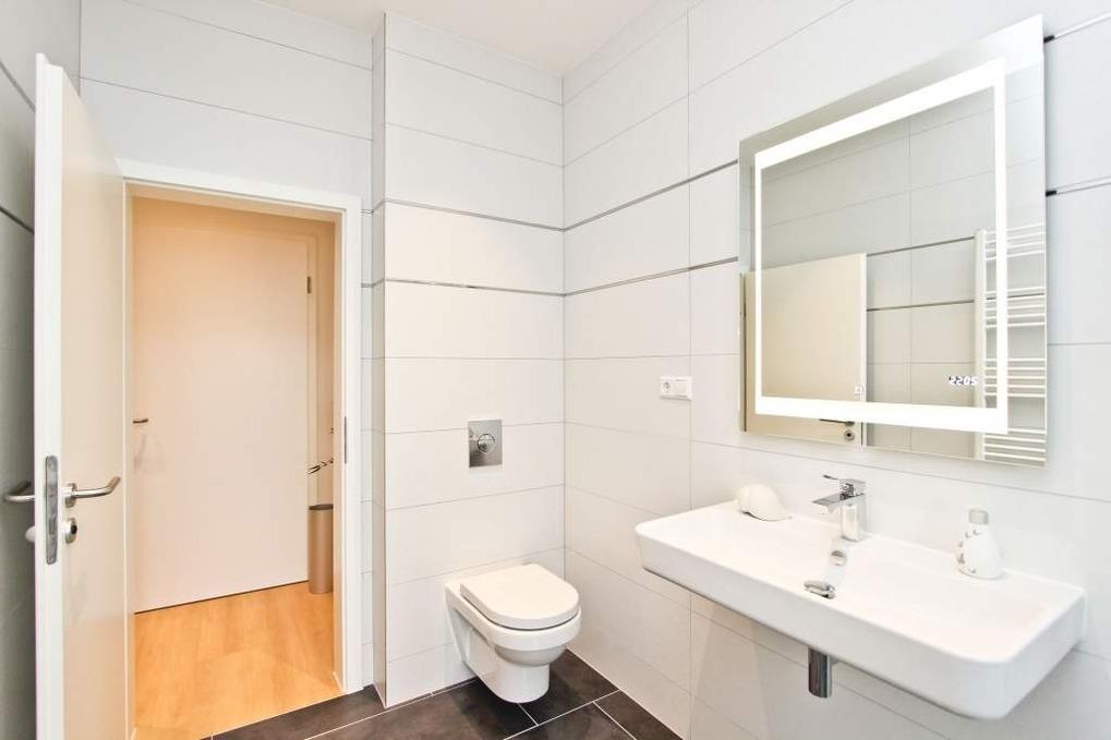 Im Badezimmer finden Sie neben einem WC eine ebenerdige Walk-in-Dusche mit Regenduschfunktion sowie mit einem tollen Design der Verglasung vor. Ausreichend Ablagemöglichkeiten sind hier ebenfalls vorhanden. Ihre Handtücher können Sie auf einem Handtuchheizkörper ablegen und wärmen, sodass Sie nach Ihrem Duschgang vollkommen entspannt sind. Spa-Feeling pur!