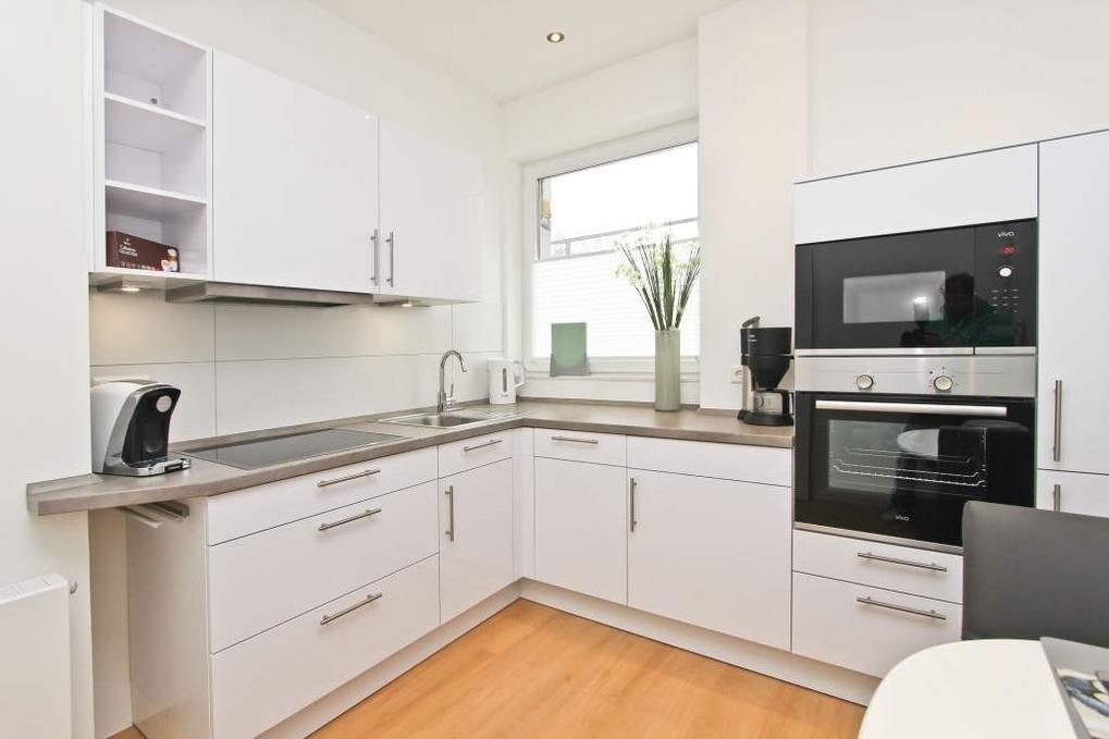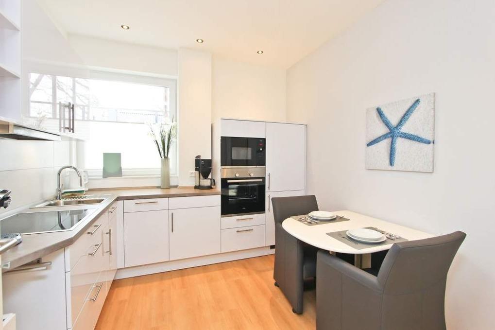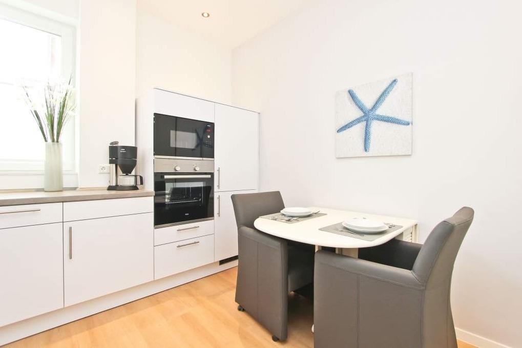 In der separaten, modern eingerichteten Küche stehen Ihnen u.a. ein Induktionskochfeld, ein Backofen, eine Mikrowelle und ein Geschirrspüler zur Verfügung. Selbstverständlich finden Sie darüber hinaus eine Kaffeemaschine, eine Kaffeekapselmaschine von Tchibo Cafissimo einen Wasserkocher und einen Toaster vor. Alles in allem ist die Küche sehr hochwertig und mit allen notwendigen Geräten und Utensilien ausgestattet. Ebenfalls haben Sie hier eine zusätzliche Sitzgelegenheit für 2 Personen.
