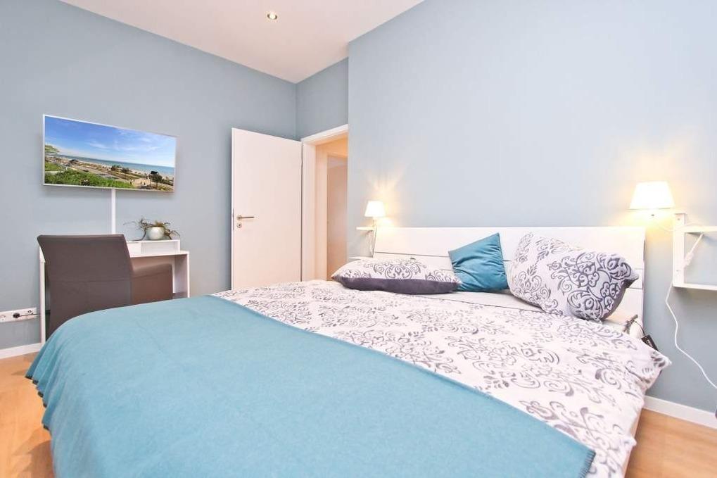 Das separate Schlafzimmer der Ferienwohnung Niendorf ist mit einem hochwertigen Doppelbett (180x200cm; 2 Matratzen jeweils 90x200cm), einem geräumigen Kleiderschrank und einem zweiten Flatscreen-TV ausgestattet. Für den besonderen Schlafkomfort sorgen Verdunkelungsjalousien, durch die sich der Raum komplett abdunkeln lässt.