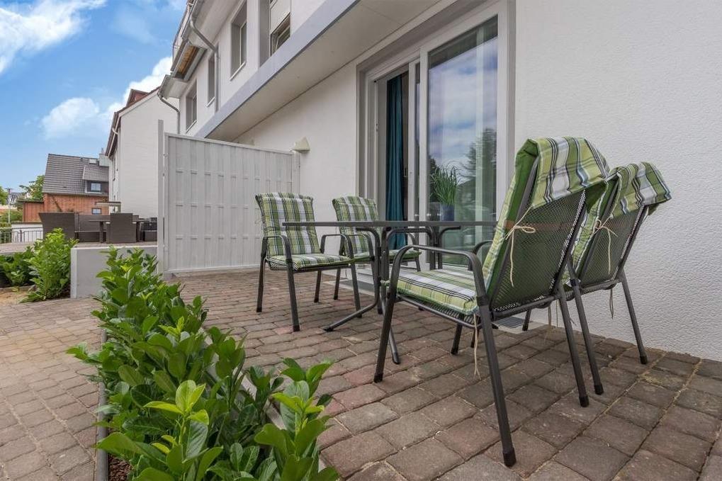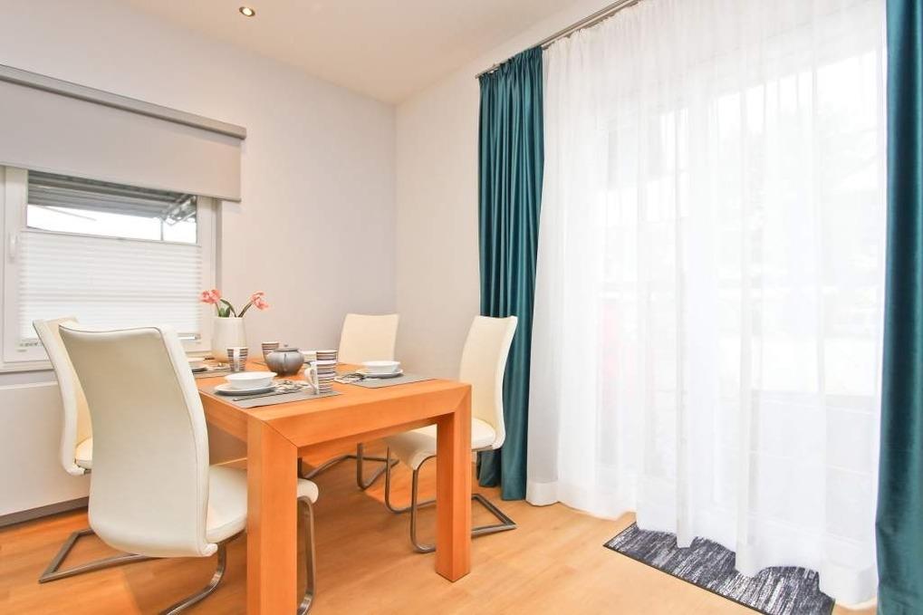Ebenso erwartet Sie im Wohnraum ein gemütlicher Essbereich für bis zu 4 Personen. Vom Wohnbereich aus gelangen Sie auf die kleine, nach Osten ausgerichtete Terrasse Richtung Meer, auf welcher Sie sich morgens zum Frühstück von den wohlig warmen Sonnenstrahlen wachkitzeln lassen und die erfrischende Ostseeluft genießen können. Der perfekte Start in einen traumhaften Urlaubstag an der Ostsee!