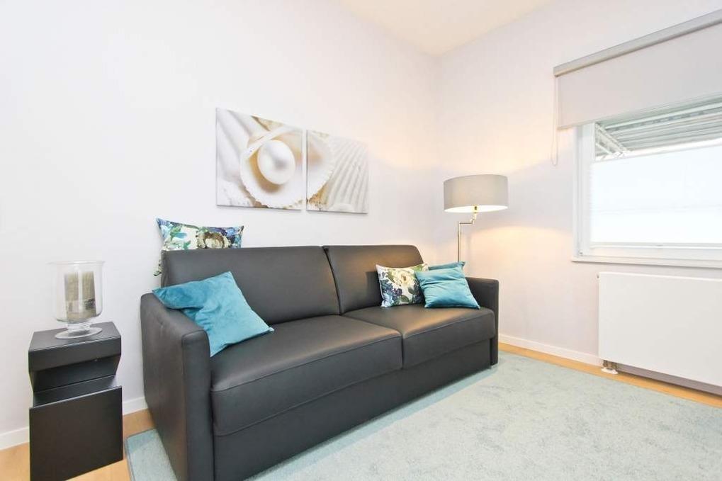 Es erwartet Sie eine großzügige, einladende Diele, die mit maritimem Design direkt Lust auf 'Meer' macht. Der separate, helle Wohnbereich bietet Ihnen neben einem komfortablen Ohrensessel sowie einem Flatscreen-TV eine hochwertige Ledercouchgarnitur. Diese bildet mit ihrer Schlaffunktion (ausziehbar auf 160x190cm) eine komfortable Schlafmöglichkeit für die dritte und vierte Person. Der Wohnbereich, der somit ebenso als Schlafbereich fungiert, ist räumlich von der Diele getrennt und lässt sich durch Verdunkelungsjalousien abdunkeln. Während Frühaufsteher schon das Frühstück in der separaten Küche vorbereiten können, können sich Langschläfer noch genüsslich von ereignisreichen Urlaubstagen erholen.