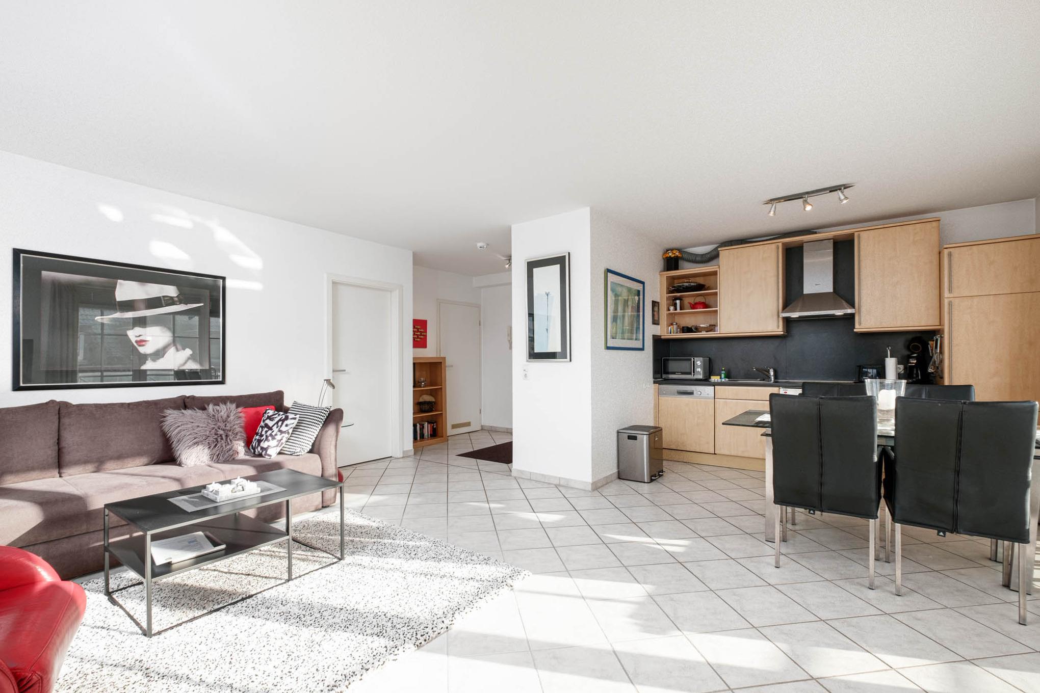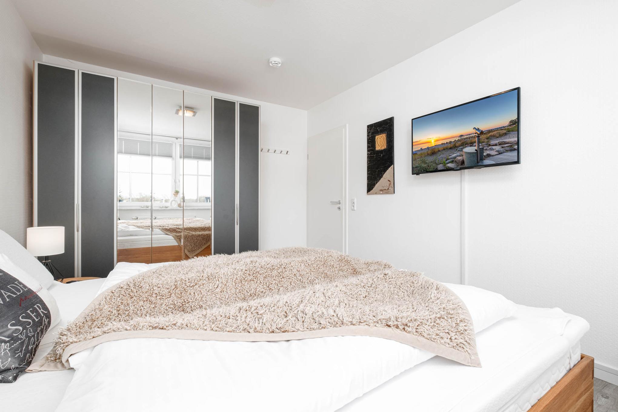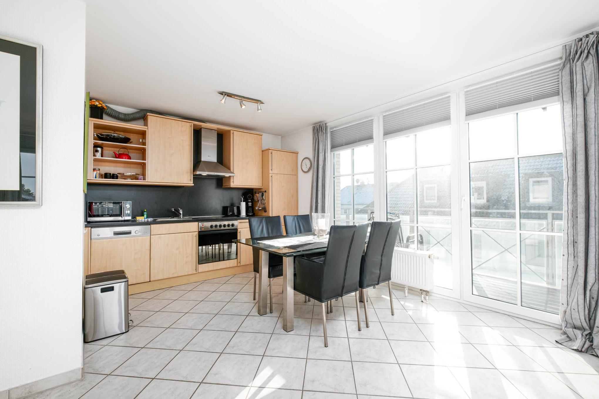 Das moderne 2-Zimmer-Appartement Nr. 34 liegt in der 2. Etage des Hauses. Die Niendorf Ferienwohnung ist für maximal 4 Personen ausgestattet und verfügt über ein Wohnzimmer mit moderner Couchgarnitur, Smart-TV und Stereo-Anlage. Eine gemütliche Essecke verbindet das Wohnzimmer mit der offenen Einbauküche mit Ceranfeld, Backofen, Geschirrspüler und Mikrowelle. Darüber hinaus finden Sie eine Filter Kaffeemaschine und eine Senseo Maschine vor. Vom Wohnzimmer mit komfortabler Schlafcouch (140x200cm) geht es außerdem auf die beiden möblierten Balkone (1. Süd-West-Lage, 2. Nord-West-Lage), teilweise mit seitlichem Meerblick. Das Wohnzimmer ist mit einem Smart-TV ausgestattet. Das separate Schlafzimmer der Ferienwohnung Niendorf ist mit einem Doppelbett (180 x 200cm, zwei separate Matratzen), Kleiderschrank und Smart-TV möbliert.Um Ihnen einen erholsamen Schlaf zu garantieren, lassen sich die Schlafräume der Ferienwohnung verdunkeln. Das Duschbad und die Diele runden dieses modern und geschmackvolle Urlaubsdomizil an der Ostsee ab.