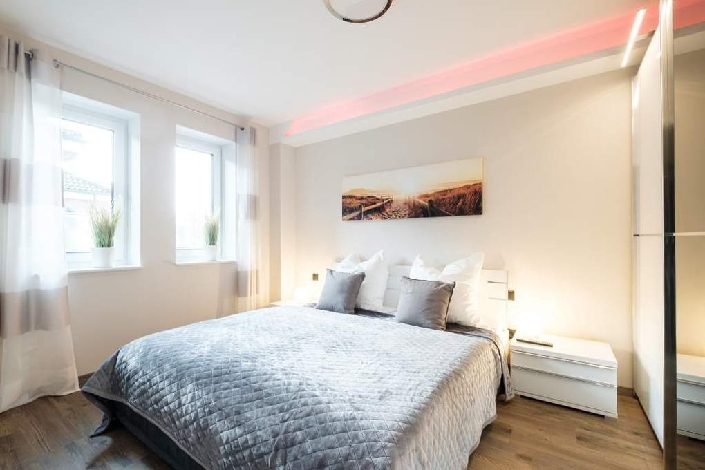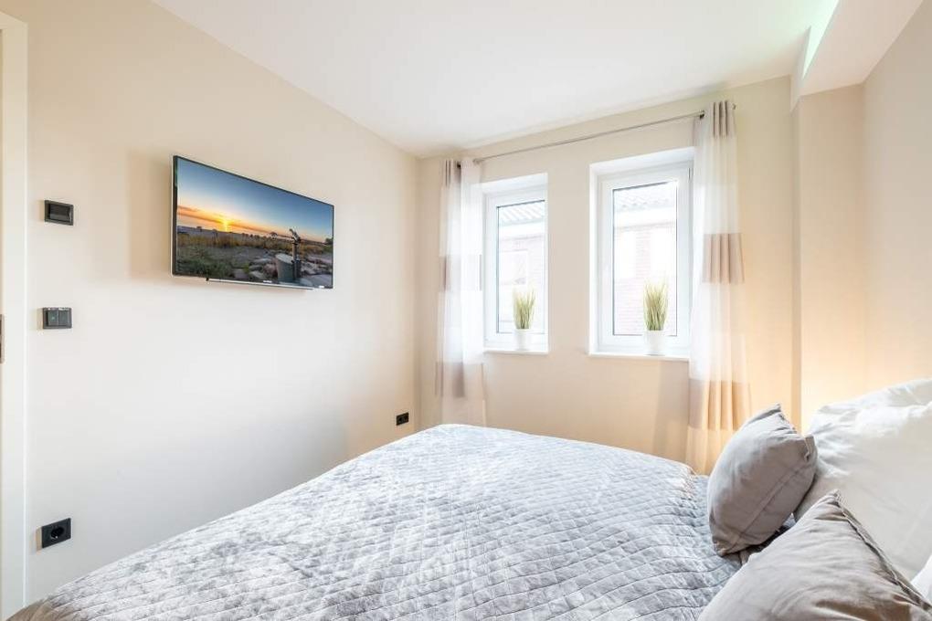 Beide Schlafräume der Ferienwohnung sind mit elektrischen Außenjalousien ausgestattet, welche Ruhe und einen erholsamen Schlaf garantieren. Darüber hinaus lassen sich sämtliche Räume komplett abdunkeln, inklusive der Dreiecksfenster mit elektrischen Außenjalousien.