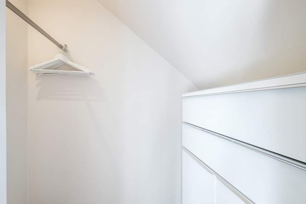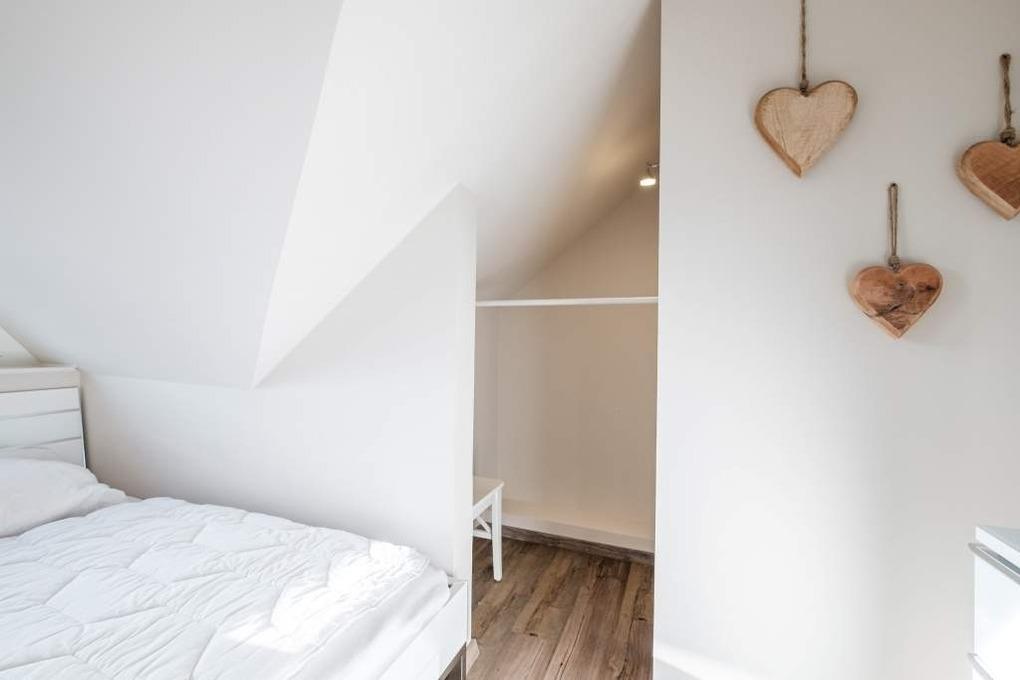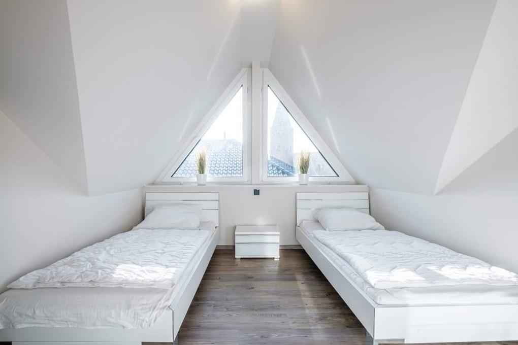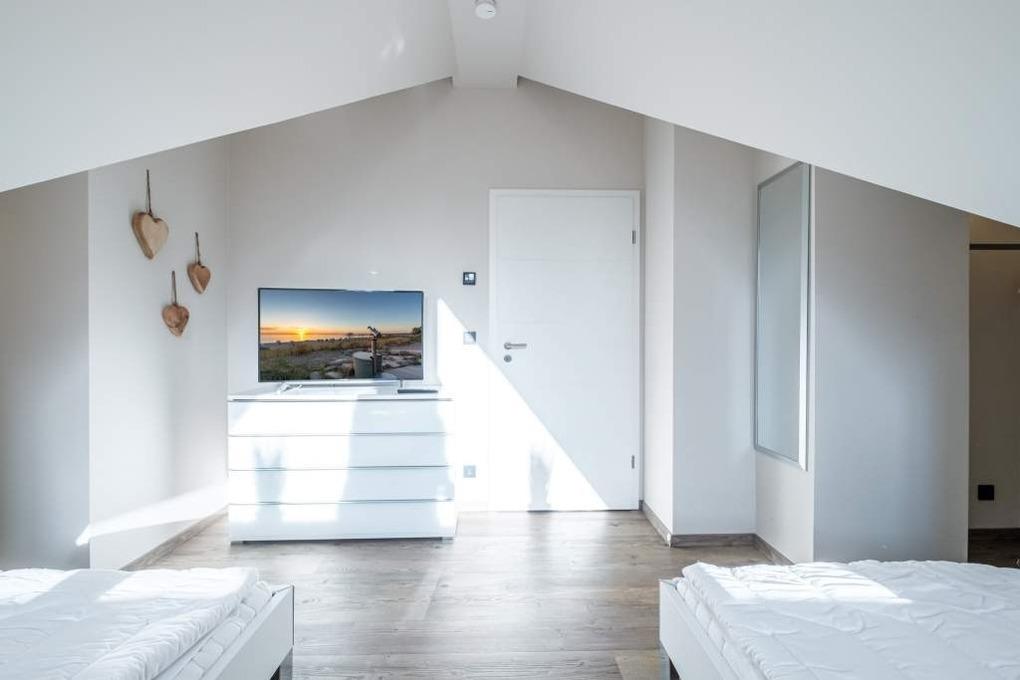 Im Dachgeschoss befindet sich das zweite Schlafzimmer mit einem zwei getrennten Betten, einem Schrank sowie einem Flatscreen-TV.