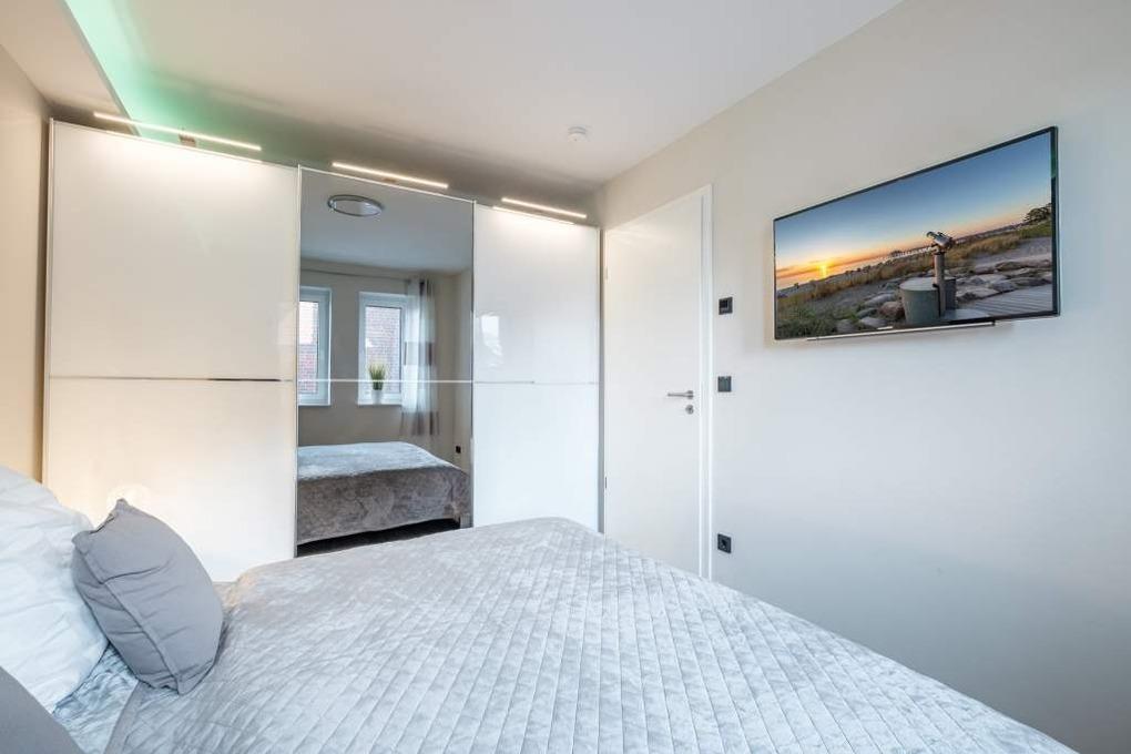 Das Schlafzimmer I befindet sich auf derselben Ebene und ist mit einem Doppelbett, großem Kleiderschrank und Flatscreen-TV ausgestattet.