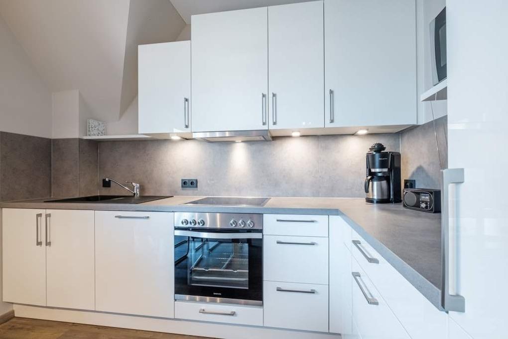 Die offene Küche ist mit allem Komfort ausgestattet u.a. sind Ceranfeld, Backofen, Mikrowelle und Geschirrspüler vorhanden.