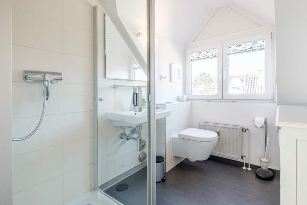 Das separate Schlafzimmer ist mit einem Boxspringbett (180x200cm) ausgestattet. Ein helles Duschbad ist ebenfalls vorhanden.