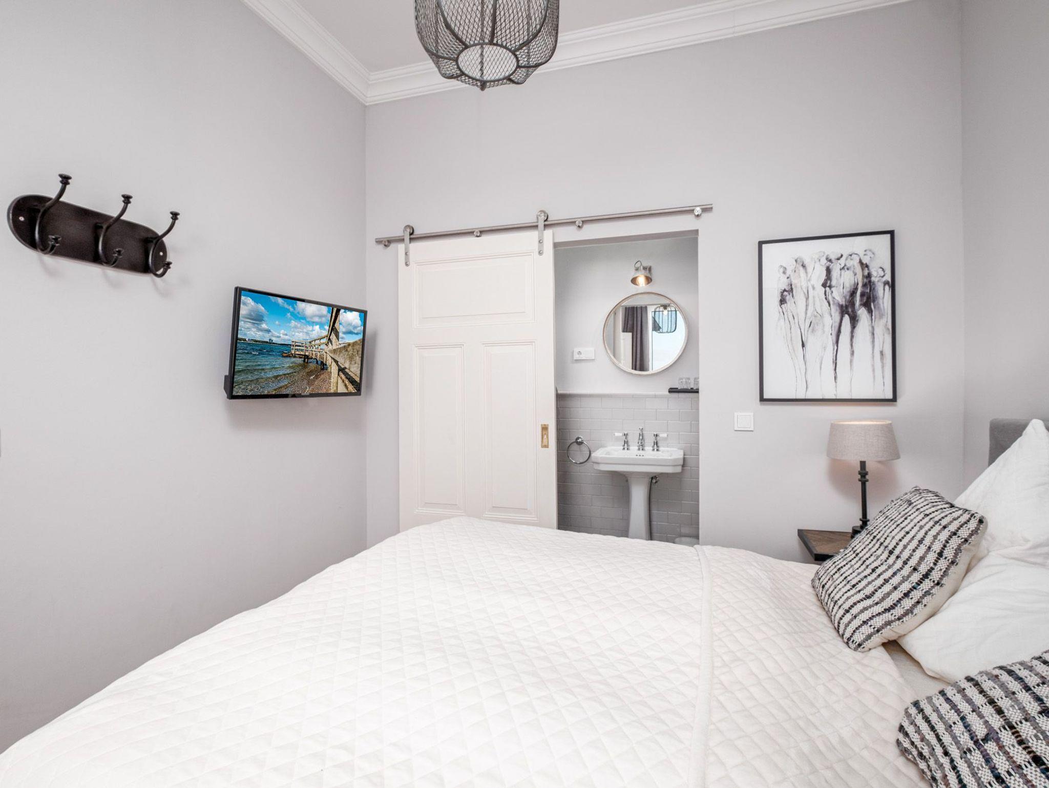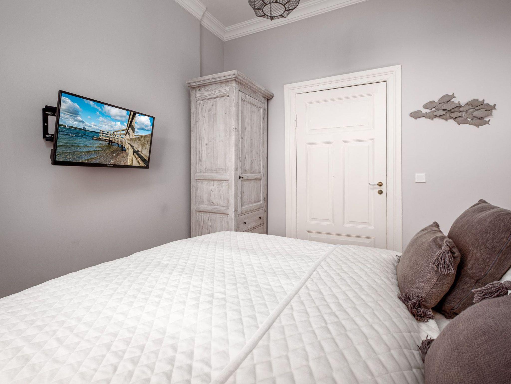 Des Weiteren finden Sie 3 Schlafzimmer mit je einem Boxspringbett (2 x 160 cm x 200 cm und 1 x 180 cm x 200 cm) und Digital-TV vor.