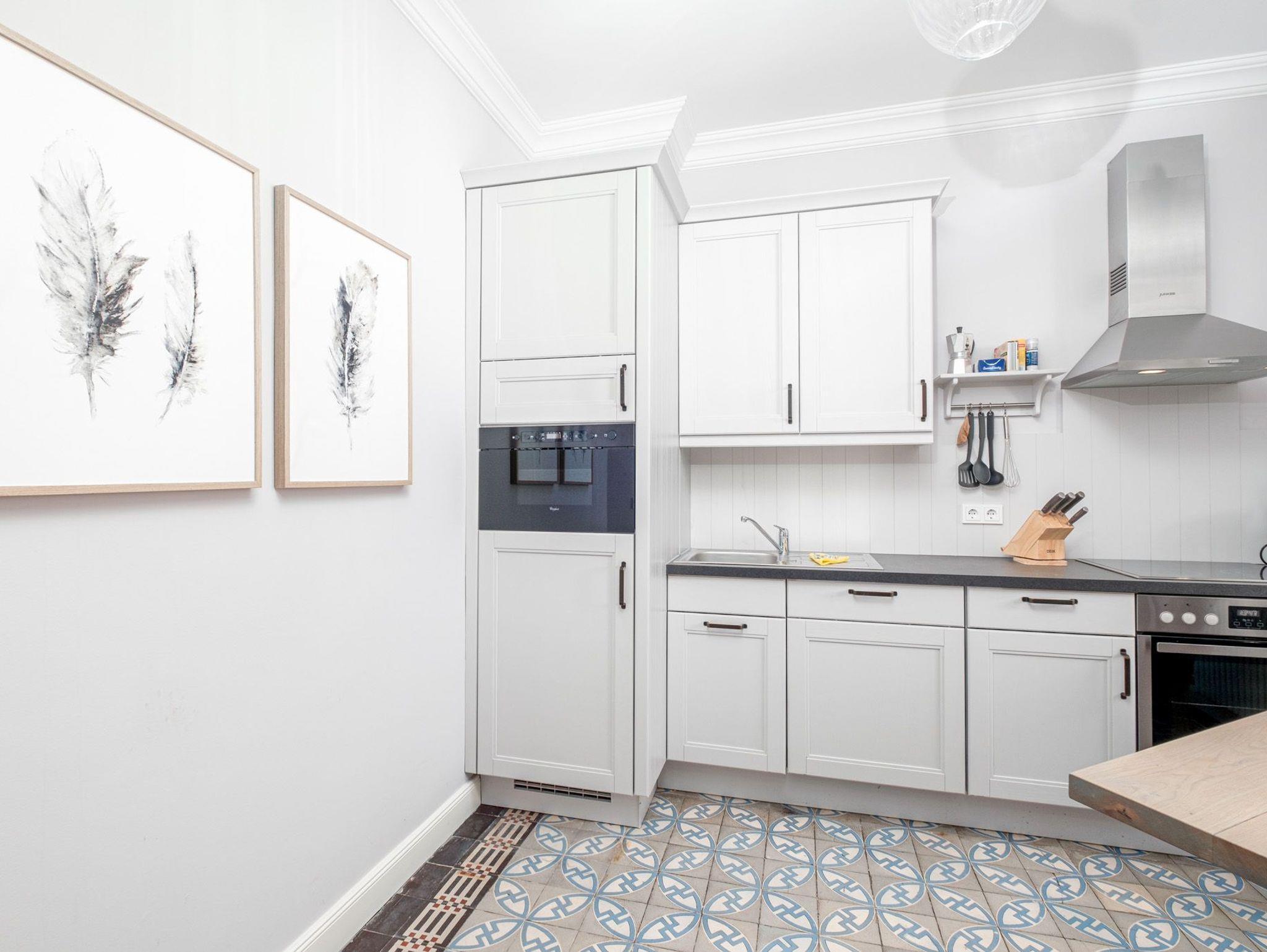 Die moderne Einbauküche ist mit einem Geschirrspüler, Mikrowelle und einem weiteren kleinen Essbereich ausgestattet.