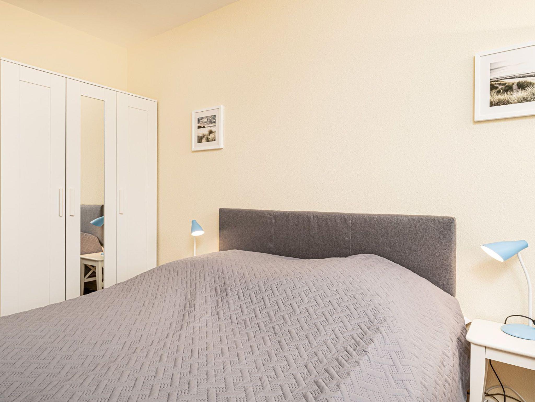 Das separate Schlafzimmer ist mit einem komfortablen Doppelbett (160 cm x 190 cm), einem zweiten TV sowie einem Kleiderschrank ausgestattet. Hier erholen Sie sich von einem ausgiebigen Strandtag.