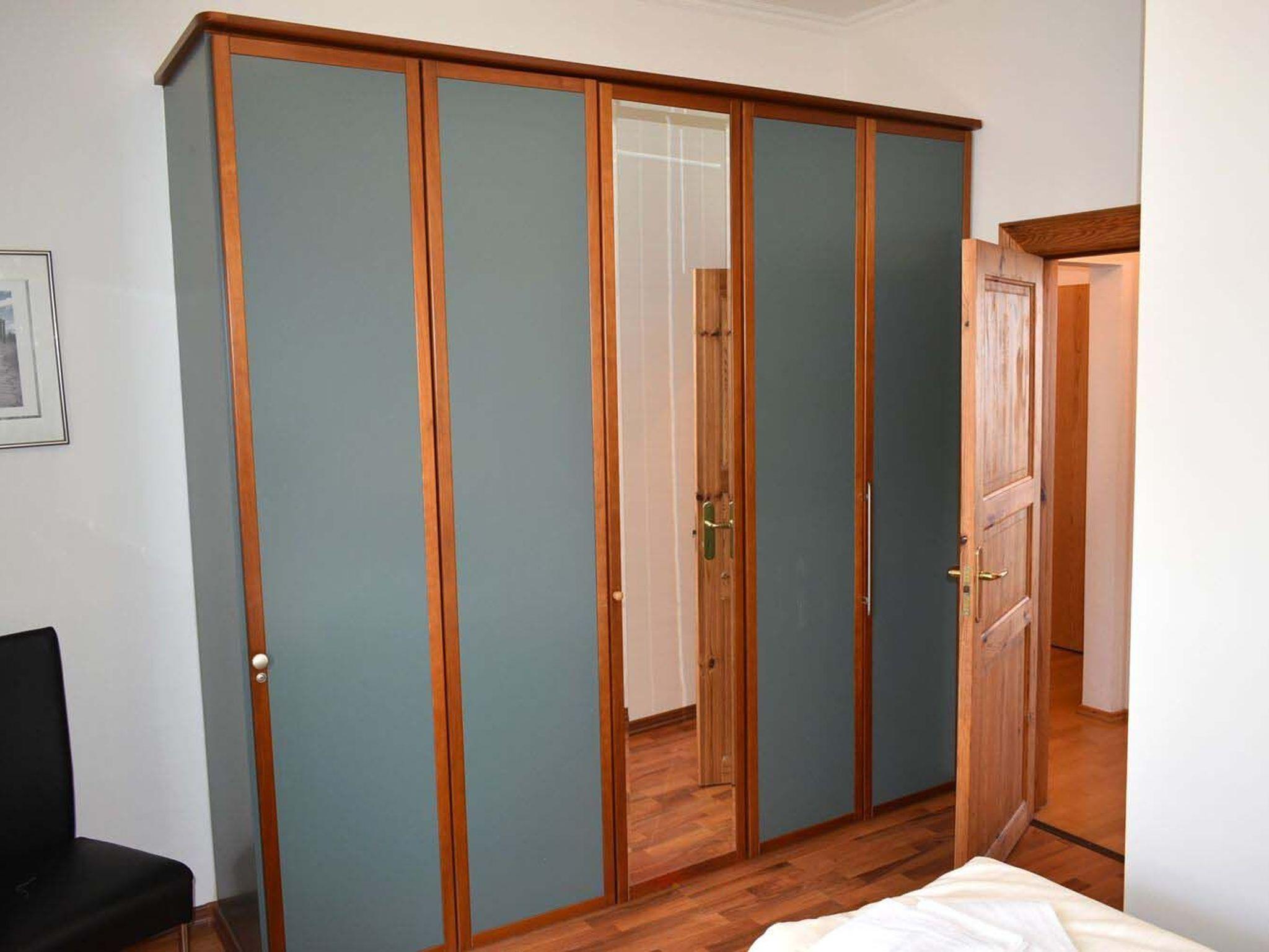 Schlafzimmer 1: 2 Matratzen, 2 Nachttische, 2 Tischlampen, Besen, Boxspringbett 2,00 x 1,60 m, Bügelbrett, Bügeleisen, Kleiderschrank mit Spiegel, Staubsauger, Stuhl, Verdunklungsplissee, Wäscheständer, Wischer mit Eimer