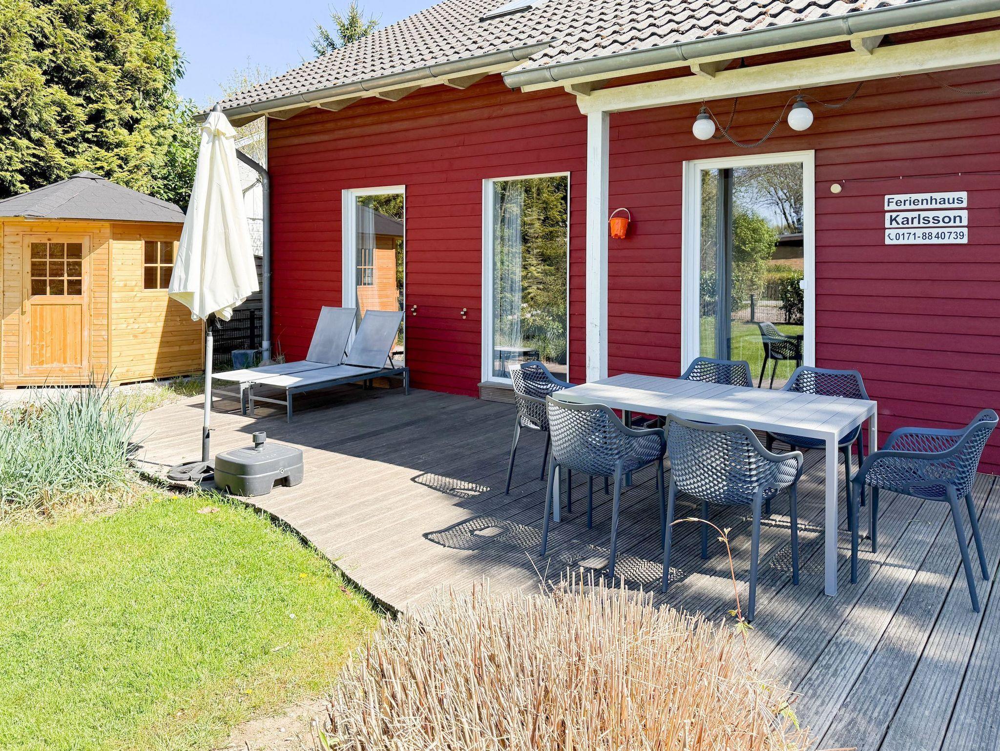 Skandinavisches Holzhaus in Niendorf/Ostsee mit Sauna, großem Garten und Strandkorb nahe dem Strand.