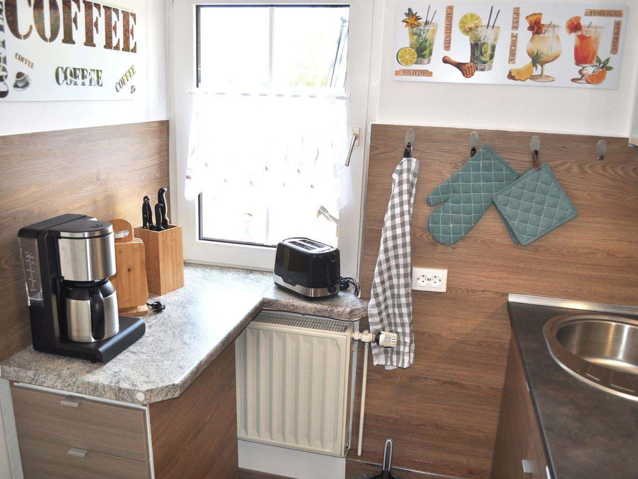 Küche: 4 Plattenherd mit Ceranfeld und Backofen, Einbauküche, Geschirr, Kaffeemaschine, Kochtöpfe, Toaster, Wasserkocher