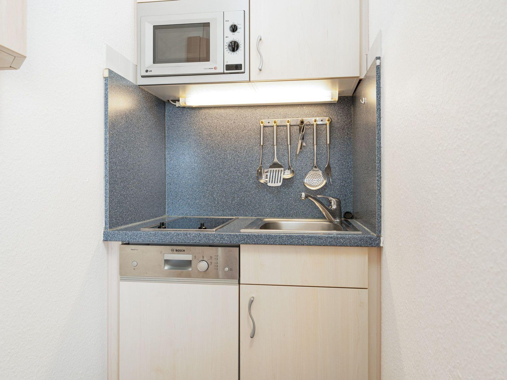 Im Wohnraum finden Sie eine bequeme Schlafcouch (140 cm x 200 cm) mit Kabel-TV, Blu-Ray-Player und HiFi-Anlage sowie eine Essecke und eine Pantryküche mit Geschirrspüler und Mikrowelle vor.